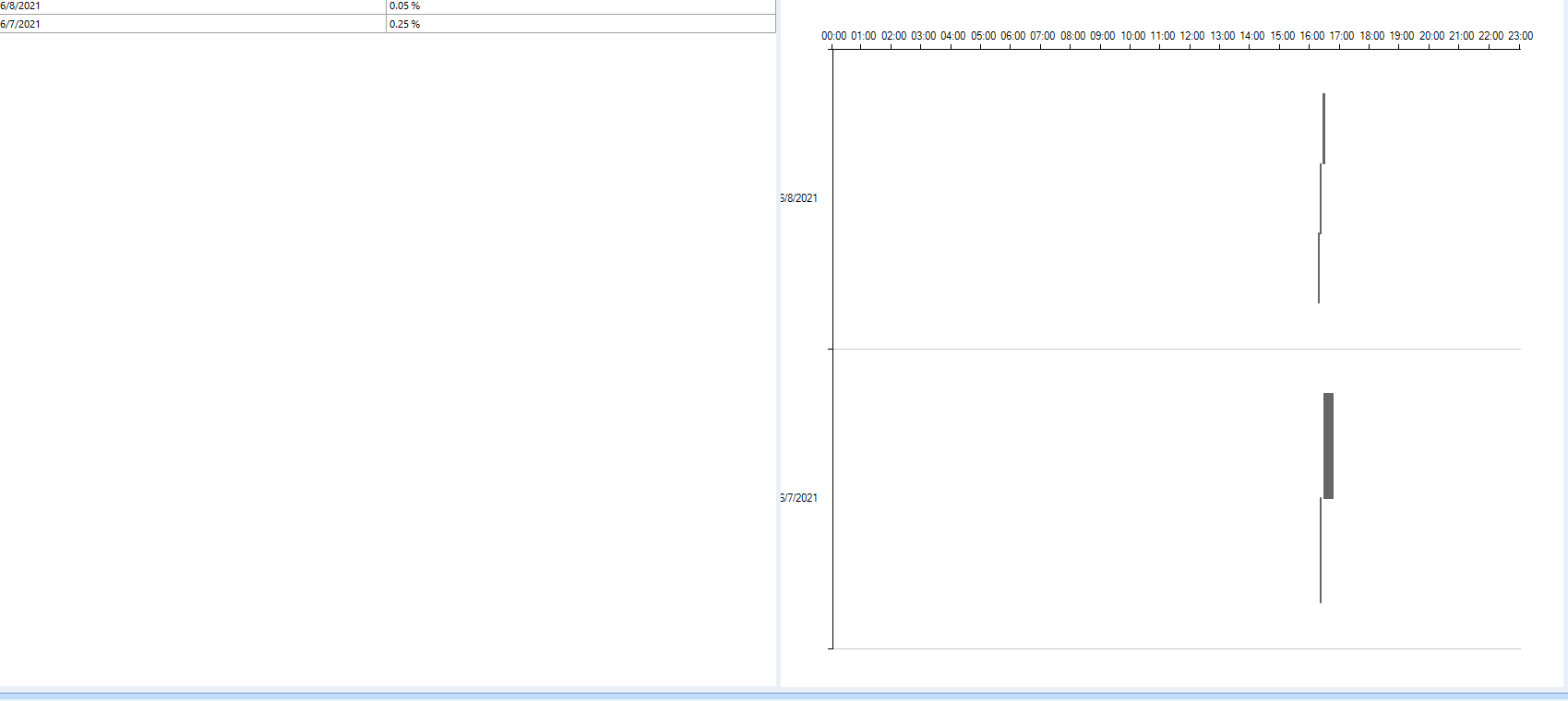 I am trying to create a page with 3 columns. Date and Percent are the first 2 columns . The 3rd column will be a range bar chart where the time span across 24 hours will be in x-axis (orientation to the top) and the date again will be on the left (we can hide the label) . It might not necessarily be a gridview , but if it is that would be great . Let me attach the mock , I tried to do the 2 columns separately and the chart separately but wanted to integrate it as a single grid .