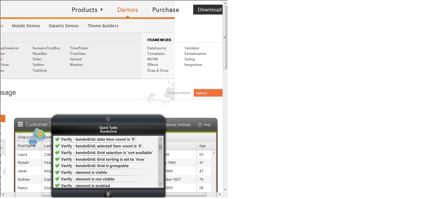 // Navigate to : 'http://demos.kendoui.com/web/grid/editing-custom.html'ActiveBrowser.NavigateTo("http://demos.kendoui.com/web/grid/editing-custom.html"); //Get the grid objectKendoGrid grid = ActiveBrowser.Find.ById<KendoGrid>("grid"); //Search for a row that contains "Chang" in its first cellforeach (KendoGridDataItem row in grid.DataItems){ if (row.Cells[0].TextContent == "Chang") { //Create a Confirm dialog ConfirmDialog cd = new ConfirmDialog(ActiveBrowser, DialogButton.OK); Manager.DialogMonitor.AddDialog(cd); Manager.DialogMonitor.Start(); //Click on the last cell to delete the row row.Cells[3].MouseClick(); //Handle the Confirm dialog cd.WaitUntilHandled(); Manager.DialogMonitor.RemoveDialog(cd); }}2. I wasn't able to reproduce the problem as you described it. See this video. Can you please provide the means to reproduce the issue locally(either in your app or on a public site), so we can continue troubleshooting? You can try to reproduce it against our Kendo Grid demos, for example.