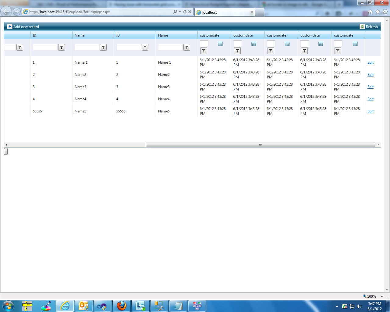 <telerik:RadGrid ID="RadGrid1" runat="server" AllowPaging="True" AllowSorting="True" OnNeedDataSource="RadGrid1_NeedDataSource" AutoGenerateColumns="false" AllowMultiRowEdit="false" AllowFilteringByColumn="true"> <PagerStyle Mode="NextPrevAndNumeric" /> <MasterTableView Name="Parent" CommandItemDisplay="Top"> <Columns> <telerik:GridBoundColumn DataField="ID" HeaderText="ID" UniqueName="ID"> </telerik:GridBoundColumn> <telerik:GridBoundColumn DataField="Name" HeaderText="Name" UniqueName="Name"> </telerik:GridBoundColumn> <telerik:GridBoundColumn DataField="ID" HeaderText="ID" UniqueName="ID1"> </telerik:GridBoundColumn> <telerik:GridBoundColumn DataField="Name" HeaderText="Name" UniqueName="Name1"> </telerik:GridBoundColumn> <telerik:GridBoundColumn DataField="ID" HeaderText="ID" UniqueName="ID2"> </telerik:GridBoundColumn> <telerik:GridBoundColumn DataField="Name" HeaderText="Name" UniqueName="Name2"> </telerik:GridBoundColumn> <telerik:GridBoundColumn DataField="ID" HeaderText="ID" UniqueName="ID3"> </telerik:GridBoundColumn> <telerik:GridBoundColumn DataField="Name" HeaderText="Name" UniqueName="Name4"> </telerik:GridBoundColumn> <telerik:GridBoundColumn DataField="ID" HeaderText="ID" UniqueName="ID5"> </telerik:GridBoundColumn> <telerik:GridBoundColumn DataField="Name" HeaderText="Name" UniqueName="Name5"> </telerik:GridBoundColumn> <telerik:GridDateTimeColumn DataField="customdate" UniqueName="customdate" HeaderText="customdate"> </telerik:GridDateTimeColumn> <telerik:GridDateTimeColumn DataField="customdate" UniqueName="cust1omdate" HeaderText="customdate"> </telerik:GridDateTimeColumn> <telerik:GridDateTimeColumn DataField="customdate" UniqueName="custo2mdate" HeaderText="customdate"> </telerik:GridDateTimeColumn> <telerik:GridDateTimeColumn DataField="customdate" UniqueName="cust3omdate" HeaderText="customdate"> </telerik:GridDateTimeColumn> <telerik:GridDateTimeColumn DataField="customdate" UniqueName="custo4mdate" HeaderText="customdate"> </telerik:GridDateTimeColumn> <telerik:GridEditCommandColumn> </telerik:GridEditCommandColumn> </Columns> </MasterTableView> <ClientSettings> <Scrolling AllowScroll="true" UseStaticHeaders="true" /> </ClientSettings> </telerik:RadGrid>protected void RadGrid1_NeedDataSource(object sender, GridNeedDataSourceEventArgs e) { DateTime dt = DateTime.Now; dynamic data = new[] { new { ID = 1, Name ="Name_1", customdate=dt,NO = 11.00,CustomerId="ALFKI",Stock=20,IsSysAdmin = true}, new { ID = 2, Name = "Name2", customdate=dt,NO = 11.00,CustomerId="ALFKI2",Stock=30,IsSysAdmin = false}, new { ID = 3, Name = "Name3", customdate=dt,NO = 11.00,CustomerId="ALFKI1",Stock=20,IsSysAdmin = true}, new { ID = 4, Name = "Name4", customdate=dt,NO = 11.44,CustomerId="ALFKI",Stock=40,IsSysAdmin = true}, new { ID = 55555, Name = "Name5", customdate=dt,NO = 10.4,CustomerId="ALFKI",Stock=20,IsSysAdmin = true} }; RadGrid1.DataSource = data; }Note : If you still get the issue then try to set FiltercontrolWidth="100px".