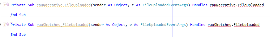 I've run into an issue where I'm unable to have multiple events of .FileUploaded. The postback triggers the control's event to start processing but If I add more than 1 and create an event it shows it's not a valid move to have more than one .FileUploaded events per page.