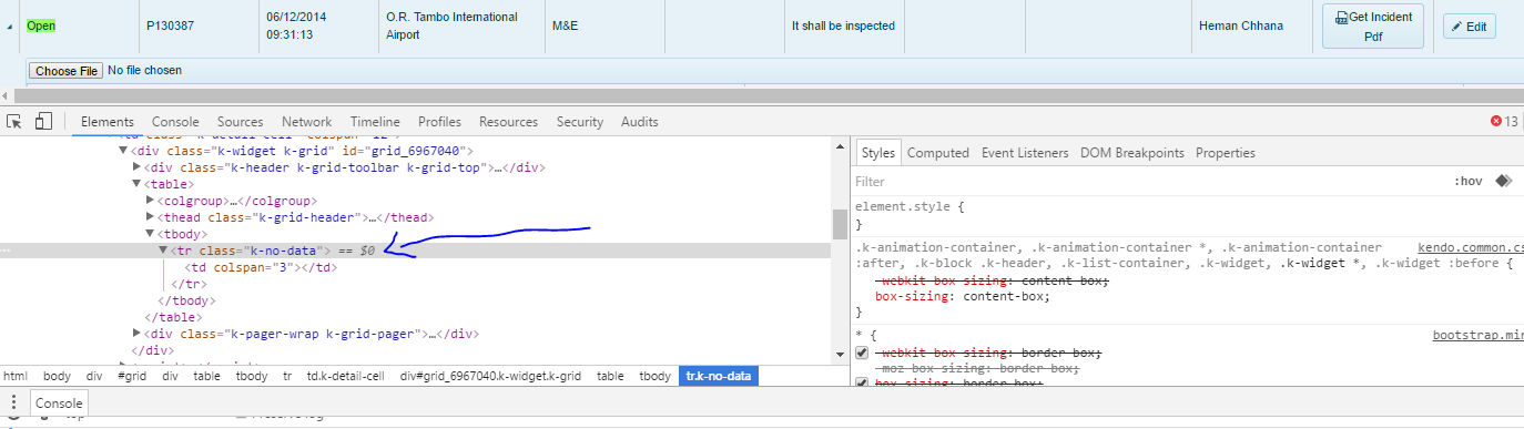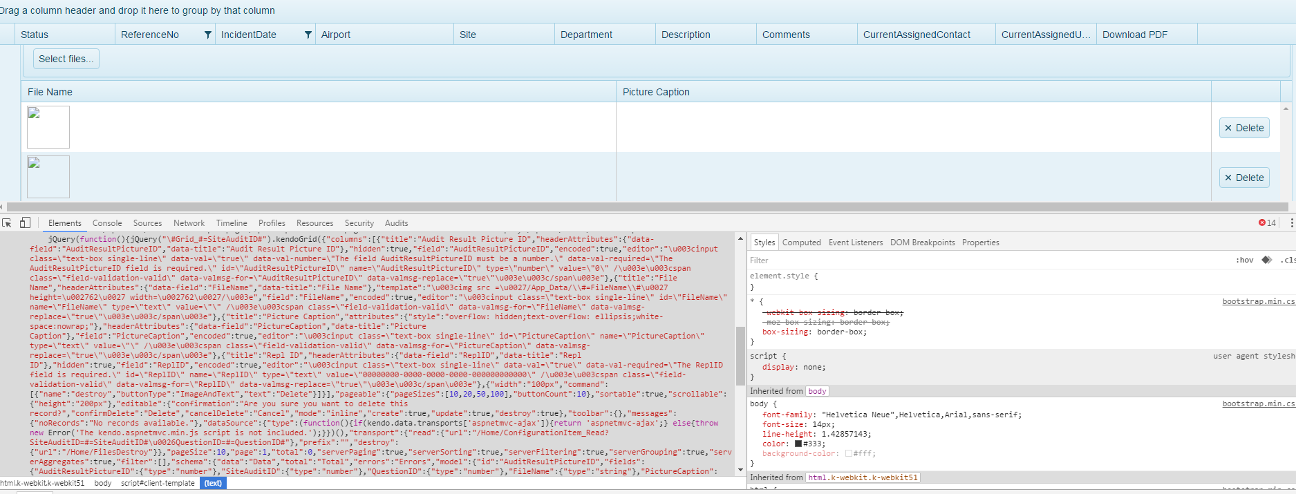 <div style="clear:both; position:relative; padding-top: 10px">@(Html.Kendo().Grid<KendoUIApp1_Test.Models.IncidentsViewModel>() .Name("grid") .Columns(colums => { */ colums.Bound(p => p.DepartmentID).Hidden(true); colums.Bound(p => p.SiteAuditID).Hidden(true); colums.Bound(p => p.QuestionID).Hidden(true); colums.Bound(p => p.StatusName).Title("Status").Filterable(false).ClientTemplate( "# if (StatusID === 1 ) { #" + "<span class='CBdrawingstatusGreen'>#:StatusName#</span>" + "# } else if (StatusID === 2 ) { #" + "<span class='CBdrawingstatusYellow'>#:StatusName#</span>" + "# } else { #" + "<span class='CBdrawingstatusred'>#:StatusName#</span>" + "# } #" ); colums.Bound(p => p.ReferenceNo).Title("ReferenceNo").Filterable(true); colums.Bound(p => p.IncidentDate).Title("IncidentDate").ClientTemplate("#= kendo.format('{0:MM/dd/yyyy HH:mm:ss}',kendo.parseDate(IncidentDate)) #"); //.Filterable(model => model.UI("IncidentDateFilter")); colums.Bound(p => p.AccountName).Title("Airport").Filterable(false).Width(200); colums.Bound(p => p.SiteName).Title("Site").Filterable(false); colums.Bound(p => p.Department1).Title("Department").Filterable(false); colums.Bound(p => p.Description).Title("Description").Filterable(false); colums.Bound(p => p.Comments).Title("Comments").Filterable(false); colums.Bound(p => p.ContactName).Title("CurrentAssignedContact").Filterable(false).Width(200); colums.Bound(p => p.FirstName).Title("CurrentAssignedUser").Filterable(false); colums.Bound(p => p.IncidentID).ClientTemplate("<a class='k-button' href='" + Url.Action("GetPDF", "Home") + "?IncidentID=#= IncidentID #'" + "> <span span class='k-icon k-i-pdf''></span>Get Incident Pdf</a>").Title("Download PDF").Filterable(false); colums.Command(cmd => { cmd.Edit(); //cmd.Custom("Upload").Click("onCustomCommandClick"); }); }) .ClientDetailTemplateId("client-template") .Filterable(filterable => filterable .Extra(true) .Operators(operators => operators .ForString(str => str.Clear() .StartsWith("Starts with") .IsEqualTo("Is equal to") .IsNotEqualTo("Is not equal to") )) ) .HtmlAttributes(new { style = "height:550px;" }) .DataSource(datasource => datasource .Ajax() //Configure the grid data source .Events(Eevents => Eevents.RequestEnd("OnChangeRefresh")) .Model(model => { model.Id(m => m.IncidentID); }) .Read(read => { read.Action("GetIncidents", "Home").Data("IncidentsFilter"); })// set the action method which will return the data in json format .Update(update => update.Action("Incidents_Update", "Home")) ) .Navigatable() .Groupable() .Pageable() .Reorderable(reorder => reorder.Columns(true)) .Sortable() .Scrollable() .Events(events => { events.Save("onIncidentUserAssign"); // events.Save("onStatusChange"); }) .Events(eEvents => eEvents.Edit("disableOnEdit")) .Events(x => x.DataBound("onDataBound")) //.Events(events => //{ // events.Save("onStatusChange"); // // events.Save("onStatusChange"); //}) .Editable(ed => ed.Mode(GridEditMode.PopUp).TemplateName("Incidents") .Window(w => w.Animation(true) .Scrollable(false) .Name("editWindow"))) ) </div><script id="client-template" type="text/x-kendo-template"> @(Html.Kendo().Grid<KendoUIApp1_Test.Models.AuditPicIncidentModel>() .Name("Grid_#=SiteAuditID#") .ToolBar(toolbar => toolbar.Template( @<text> @(Html.Kendo().Upload() .Name("files") .Async(a => a.Save("Save", "Home")) .Events(e => e.Success("onUploadSuccess")) .ShowFileList(false) // Hide the file list as we're displaying uploaded files in the Grid ) </text> )) .Columns(columns => { columns.Bound(b => b.FileName).Title("File Name"); columns.Bound(b => b.PictureCaption).Title("Picture Caption").HtmlAttributes(new { style = "overflow: hidden;text-overflow: ellipsis;white-space:nowrap;" }).EditorTemplateName("ConfigurationSettingItemEditor"); columns.Command(command => command.Destroy()).Width(100); } ) .Sortable() .Pageable(c => c.PageSizes(new int[] { 10, 20, 50, 100 })) .Scrollable() .HtmlAttributes(new { style = "height:430px;" }) .DataSource(datasource => datasource .Ajax() .Model(model => { model.Id(q => q.AuditResultPictureID); //model.Field(q => q.KeyValue).Editable(true); //model.Field(q => q.Enabled).DefaultValue(true); }) .PageSize(10) .ServerOperation(true) .Read(read => read.Action("ConfigurationItem_Read", "Home", new { SiteAuditID = "#=SiteAuditID#", QuestionID = "#=QuestionID#" })) .Destroy(update => update.Action("FilesDestriy", "Home")) ) .ToClientTemplate() ) </script>17 Answers, 1 is accepted