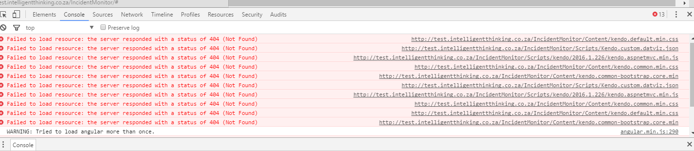 From the provided snapshots it seems that some of the kendo scripts are not loaded (404 error) also there are multiple requests for loading them. You can ensure the required scripts are loaded properly.