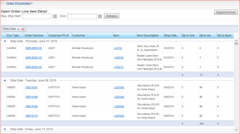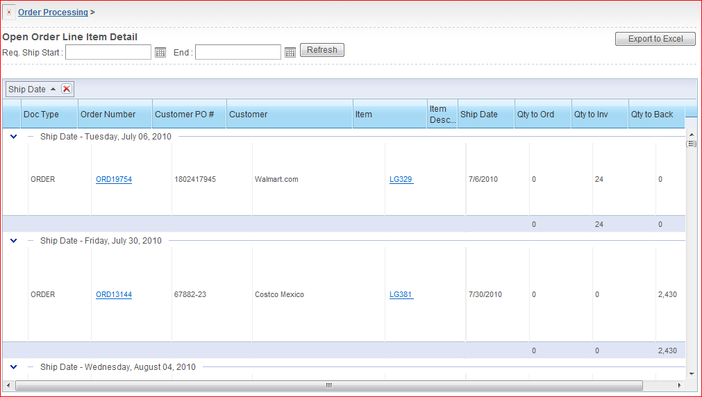 <telerik:RadGrid ID="openorderdetails" runat="server" DataSourceID="ds_openorders" Skin="Vista" Height="450px" AllowSorting="True" ShowGroupPanel="True" AutoGenerateColumns="False" GridLines="None" Width="100%"> <ExportSettings ExportOnlyData="true" Excel-FileExtension="xls" FileName="Open Order Details" Excel-Format="ExcelML" HideStructureColumns="true" Pdf-PageHeight="8.5in" Pdf-PageWidth="11in" Pdf-Title="Open Order Line Item Details"></ExportSettings> <MasterTableView Width="100%" ShowGroupFooter="true" TableLayout="Fixed"> <Columns> <telerik:GridBoundColumn DataField="docid" HeaderText="Doc Type" HeaderStyle-Width="75px" ></telerik:GridBoundColumn> <telerik:GridHyperLinkColumn DataNavigateUrlFields="sopnumbe,soptype" DataNavigateUrlFormatString="/dialogs/OrderView.aspx?sopnumbe={0}&soptype={1}" DataTextField="sopnumbe" HeaderText="Order Number" HeaderStyle-Width="100px" target="_blank"></telerik:GridHyperLinkColumn> <telerik:GridBoundColumn DataField="cstponbr" HeaderText="Customer PO #" HeaderStyle-Width="100px" ></telerik:GridBoundColumn> <telerik:GridBoundColumn DataField="custname" HeaderText="Customer" HeaderStyle-Width="175px" ></telerik:GridBoundColumn> <telerik:GridHyperLinkColumn DataNavigateUrlFields="itemnmbr" DataNavigateUrlFormatString="/inventory/salesinventory.aspx?itemnmbr={0}&levelfilter=3,4&factorlevel=1" DataTextField="itemnmbr" HeaderText="Item" HeaderStyle-Width="100px" GroupByExpression="newitemnumber [Item Number], Sum(qtytoinv) qtytoinv [Qty to Invoice] Group By newitemnumber" Target="_blank"></telerik:GridHyperLinkColumn> <telerik:GridBoundColumn DataField="itemdesc" HeaderText="Item Description"></telerik:GridBoundColumn> <telerik:GridBoundColumn DataField="reqshipdate" HeaderText="Ship Date" HeaderStyle-Width="75px" DataType="System.DateTime" DataFormatString="{0:d}"></telerik:GridBoundColumn> <telerik:GridBoundColumn DataField="qtyorder" Aggregate="Sum" FooterAggregateFormatString="{0:N0}" HeaderText="Qty to Ord" HeaderStyle-Width="75px" DataType="System.Decimal" DataFormatString="{0:N0}"></telerik:GridBoundColumn> <telerik:GridBoundColumn DataField="qtytoinv" Aggregate="Sum" FooterAggregateFormatString="{0:N0}" HeaderText="Qty to Inv" HeaderStyle-Width="75px" DataType="System.Decimal" DataFormatString="{0:N0}"></telerik:GridBoundColumn> <telerik:GridBoundColumn DataField="qtytbaor" Aggregate="Sum" FooterAggregateFormatString="{0:N0}" HeaderText="Qty to Back" HeaderStyle-Width="75px" DataType="System.Decimal" DataFormatString="{0:N0}"></telerik:GridBoundColumn> </Columns> <GroupByExpressions> <telerik:GridGroupByExpression> <SelectFields> <telerik:GridGroupByField FieldAlias="ReqShipDate" FieldName="ReqShipDate" FormatString="{0:D}" HeaderText="Ship Date" HeaderValueSeparator=" - "></telerik:GridGroupByField> </SelectFields> <GroupByFields> <telerik:GridGroupByField FieldName="ReqShipDate"></telerik:GridGroupByField> </GroupByFields> </telerik:GridGroupByExpression> </GroupByExpressions> </MasterTableView> <ClientSettings AllowGroupExpandCollapse="True" AllowDragToGroup="True"> <Scrolling AllowScroll="true" UseStaticHeaders="true" SaveScrollPosition="true" /> </ClientSettings> <GroupingSettings ShowUnGroupButton="true" /> </telerik:RadGrid>0