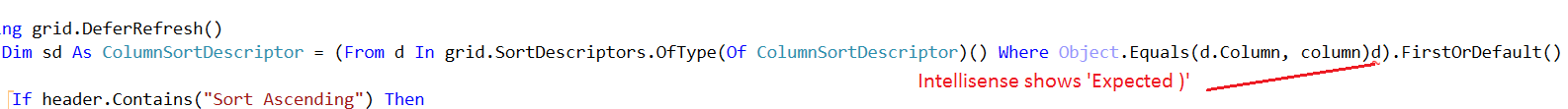 There is an error in the code in the vb example in the linq expression the intellisense reports a missing closing bracket ')' see attached image. do you have a fix for this.