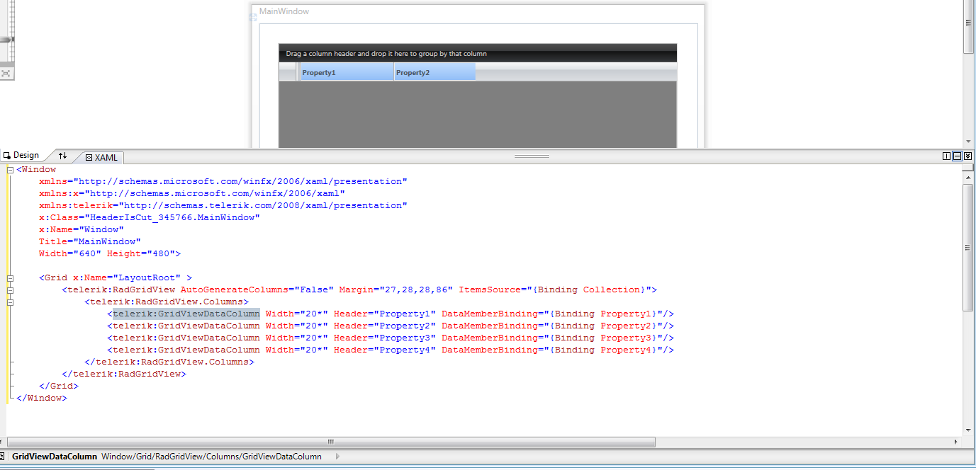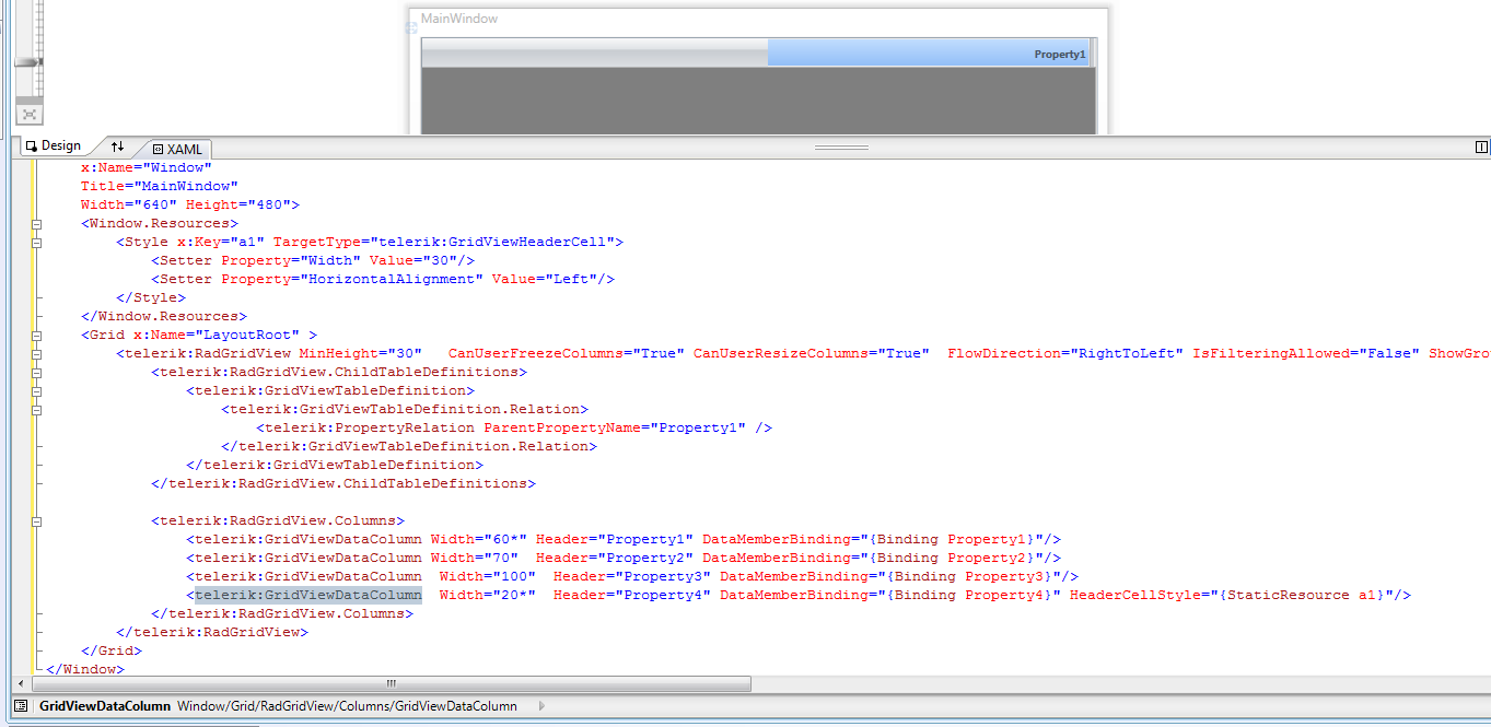 <telerik:RadGridView Name="gvRequest" xmlns:telerik="http://schemas.telerik.com/2008/xaml/presentation" ShowColumnFooters="True" CanUserFreezeColumns="False" IsReadOnly="True" AutoGenerateColumns="False" HorizontalContentAlignment="Right" ScrollViewer.HorizontalScrollBarVisibility="Auto"FlowDirection="RightToLeft"telerik:StyleManager.Theme="Simple"ScrollMode="RealTime" ScrollViewer.VerticalScrollBarVisibility="Auto"