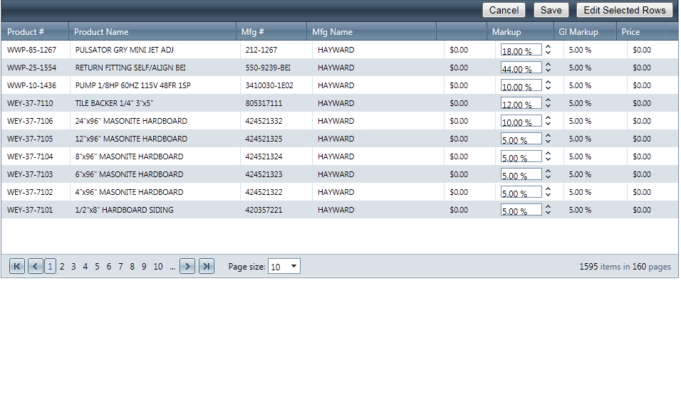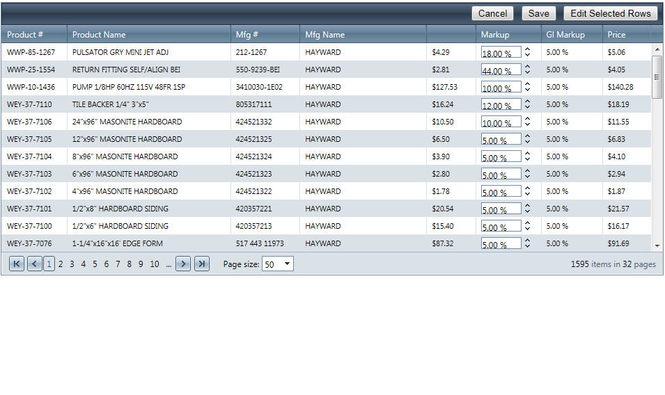 <telerik:RadGrid ID="gProducts" runat="server" AllowPaging="true" AllowSorting="true" AutoGenerateColumns="false" PageSize="50" AllowMultiRowSelection="true" Width="100%"> <ItemStyle Font-Size="8pt" Height="10px" /> <AlternatingItemStyle Font-Size="8pt" Height="10px" /> <PagerStyle Mode="NextPrevAndNumeric" AlwaysVisible="true" /> <ClientSettings> <Scrolling AllowScroll="true" ScrollHeight="100%" UseStaticHeaders="true" /> <ClientEvents OnCommand="gProducts_Command" /> <Selecting AllowRowSelect="true" /> </ClientSettings> <MasterTableView ClientDataKeyNames="StockingListItemID" CommandItemDisplay="Top" TableLayout="Auto"> <CommandItemTemplate> <div style="height: 30px; text-align: right;"> <asp:Button ID="imgCancelChanges" runat="server" Text="Cancel" ToolTip="Cancel changes" Height="24px" Style="cursor: pointer; margin: 2px 5px 0px 0px;" OnClientClick="CancelChanges(); return false;" /> <asp:Button ID="imgProcessChanges" runat="server" Text="Save" ToolTip="Save changes" Height="24px" Style="cursor: pointer; margin: 2px 5px 0px 0px;" OnClientClick="ProcessChanges(); return false;" /> <asp:Button ID="btnEditMarkup" runat="server" Text="Edit Selected Rows" Height="24px" Style="cursor: pointer; margin: 2px 5px 0px 0px;" OnClientClick="OpenWindow(); return false;" /> </div> </CommandItemTemplate> <Columns> <telerik:GridBoundColumn UniqueName="SKU" DataField="SKU" HeaderText="Product #" ReadOnly="True" HeaderStyle-Width="80px" /> <telerik:GridBoundColumn UniqueName="ProductName" DataField="ProductName" HeaderText="Product Name" ReadOnly="True" HeaderStyle-Width="200px" /> <telerik:GridBoundColumn UniqueName="ManufacturerPartNumber" DataField="ManufacturerPartNumber" HeaderText="Mfg #" ReadOnly="True" HeaderStyle-Width="85px" /> <telerik:GridBoundColumn UniqueName="ManufacturerName" DataField="ManufacturerName" HeaderText="Mfg Name" ReadOnly="True" HeaderStyle-Width="155px" /> <telerik:GridBoundColumn UniqueName="Cost" SortExpression="" DataField="Cost" HeaderText="" DataFormatString="{0:c}" ReadOnly="True" HeaderStyle-Width="60px" /> <telerik:GridTemplateColumn UniqueName="Markup" HeaderText="Markup" SortExpression="Markup" HeaderStyle-Width="80px"> <ItemTemplate> <telerik:RadNumericTextBox ID="txtMarkup" ShowSpinButtons="true" IncrementSettings-InterceptArrowKeys="true" IncrementSettings-InterceptMouseWheel="true" runat="server" MinValue="0" MaxValue="100" Type="Percent" Width="75px" Height="10px"> <ClientEvents OnValueChanged="markupChanged" /> </telerik:RadNumericTextBox> </ItemTemplate> </telerik:GridTemplateColumn> <telerik:GridBoundColumn UniqueName="GlobalMarkup" DataField="GlobalMarkup" HeaderText="Gl Markup" DataFormatString="{0:p}" HeaderTooltip="Global Markup" ReadOnly="True" HeaderStyle-Width="75px" /> <telerik:GridBoundColumn UniqueName="Price" SortExpression="" DataField="Price" HeaderText="Price" DataFormatString="{0:c}" ReadOnly="True" HeaderStyle-Width="60px" /> </Columns> </MasterTableView> </telerik:RadGrid>function updateGrid(result) { tableView.set_dataSource(result.d); tableView.dataBind();}