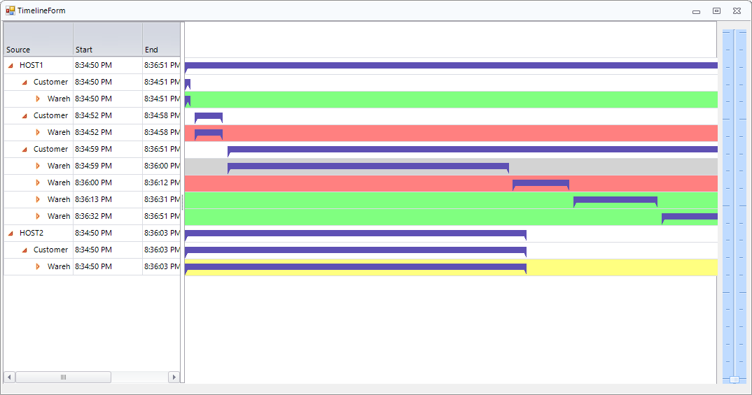 001.using System;002.using System.Collections.Generic;003.using Telerik.WinControls.UI;004. 005.namespace WarehouseBuilder.LogViewer006.{007. public class WarehouseTimelineBehavior : BaseGanttViewTimelineBehavior008. {009. public DateTime Start = DateTime.MinValue;010. public DateTime End = DateTime.MaxValue;011. 012. public override DateTime AdjustedTimelineStart013. {014. get015. {016. if (GraphicalViewElement.TimelineRange != TimeRange.Custom || Start == DateTime.MinValue)017. {018. return base.AdjustedTimelineStart;019. }020. return Start;021. }022. }023. 024. public override DateTime AdjustedTimelineEnd025. {026. get027. {028. if (GraphicalViewElement.TimelineRange != TimeRange.Custom || End == DateTime.MaxValue)029. {030. return base.AdjustedTimelineEnd;031. }032. return End;033. }034. }035. 036. public override IList<GanttViewTimelineDataItem> BuildTimelineDataItems(TimeRange range)037. {038. if (range != TimeRange.Custom)039. {040. return base.BuildTimelineDataItems(range);041. }042. return this.BuildTimelineDataItemsForDecadesRange();043. }044. 045. public IList<GanttViewTimelineDataItem> BuildTimelineDataItemsForDecadesRange()046. {047. List<GanttViewTimelineDataItem> result = new List<GanttViewTimelineDataItem>();048. DateTime currentDate = AdjustedTimelineStart;049. int currentMinuteNumber = currentDate.Minute;050. int newMinuteNumber = currentMinuteNumber;051. 052. GanttViewTimelineDataItem item = new GanttViewTimelineDataItem(currentDate, currentDate.AddMinutes(5), GraphicalViewElement.TimelineRange, GraphicalViewElement.OnePixelTime);053. 054. result.Add(item);055. 056. while (currentDate < AdjustedTimelineEnd)057. {058. item.End = currentDate.AddMinutes(5);059. currentDate = currentDate.AddMinutes(5);060. newMinuteNumber = currentDate.Minute;061. 062. if (newMinuteNumber != currentMinuteNumber && currentDate <= AdjustedTimelineEnd)063. {064. currentMinuteNumber = newMinuteNumber;065. item = new GanttViewTimelineDataItem(currentDate, currentDate, GraphicalViewElement.TimelineRange, GraphicalViewElement.OnePixelTime);066. result.Add(item);067. }068. }069. 070. return result;071. }072. 073. public override GanttTimelineCellsInfo GetTimelineCellInfoForItem(GanttViewTimelineDataItem item, TimeRange timeRange)074. {075. if (timeRange != TimeRange.Custom)076. {077. return base.GetTimelineCellInfoForItem(item, timeRange);078. }079. 080. return GetTimelineCellInfoForDecadeRange(item);081. }082. 083. public GanttTimelineCellsInfo GetTimelineCellInfoForDecadeRange(GanttViewTimelineDataItem item)084. {085. int minutes = 5;086. 087. if (item.Start == AdjustedTimelineStart)088. {089. if (item.Start.Minute % 5 > 0)090. {091. minutes = 10 - (item.Start.Minute % 5);092. }093. }094. 095. if (item.End == AdjustedTimelineEnd)096. {097. if (item.End.Minute % 5 > 0)098. {099. minutes = item.End.Minute % 5;100. }101. }102. 103. return new GanttTimelineCellsInfo(minutes);104. }105. 106. public override string GetTimelineTopElementText(GanttViewTimelineDataItem item)107. {108. if (item.Range != TimeRange.Custom)109. {110. return base.GetTimelineTopElementText(item);111. }112. 113. string format = "{0} - {1}";114. 115. return string.Format(System.Threading.Thread.CurrentThread.CurrentUICulture, format, item.Start, item.End);116. }117. 118. public override string GetTimelineBottomElementText(GanttViewTimelineDataItem item, int index)119. {120. if (item.Range != TimeRange.Custom)121. {122. return base.GetTimelineBottomElementText(item, index);123. }124. 125. string format = "{0:hh:mm}";126. 127. return string.Format(System.Threading.Thread.CurrentThread.CurrentCulture, format, new DateTime(item.Start.Minute + index, 1, 1));128. }129. }130.}