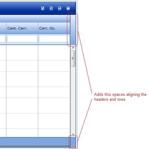 <telerik:RadGrid ID="radGridAssociates" EnableViewState="True" runat="server" AllowSorting="false" AutoGenerateColumns="false" Skin="Web20" EnableTheming="True" ClientSettings-EnableRowHoverStyle="True" EnableEmbeddedSkins="True" OnItemDataBound="RadGridAssociatesItemDataBound" Width="548px" Height="290px" OnNeedDataSource="RadGridAssociatesNeedDataSource"> <ClientSettings AllowColumnsReorder="False" EnablePostBackOnRowClick="false" ClientEvents-OnRowSelected="usePopup"> <Resizing AllowColumnResize="True" EnableRealTimeResize="True" /> <Selecting AllowRowSelect="True" /> <Scrolling AllowScroll="True" UseStaticHeaders="True" SaveScrollPosition="True" /> </ClientSettings> <MasterTableView DataKeyNames="Xref" ClientDataKeyNames="Xref" ShowHeadersWhenNoRecords="false" EnableNoRecordsTemplate="true" TableLayout="Fixed" AlternatingItemStyle-Font-Size="11px"> <ItemStyle HorizontalAlign="Center" Font-Size="11px" Width="548px"></ItemStyle> <NoRecordsTemplate> <div style="padding:5px; background:transparent; font-size:12px; text-align:left;"> No associates found </div> </NoRecordsTemplate> <Columns> <telerik:GridClientSelectColumn ButtonType="PushButton" Visible="False" CommandName="Select" Text="Select" UniqueName="column"> </telerik:GridClientSelectColumn> <telerik:GridTemplateColumn HeaderText="PIC" UniqueName="colPic"> <ItemStyle Width="30px"></ItemStyle> <HeaderStyle Font-Size="10px" Wrap="False" Width="30px"/> <ItemTemplate> <img alt='photo' src='<%= GetConfig().imageUrl %>?x=<%# Eval("XREF") %>&s=small' width="30" height="38" style="border:0px;"> </a> </ItemTemplate> </telerik:GridTemplateColumn> <telerik:GridTemplateColumn HeaderText="FLAGS" UniqueName="colFlags"> <ItemStyle Wrap="false" Font-Size="10px" Width="30px"></ItemStyle> <HeaderStyle Font-Size="10px" Wrap="False" Width="30px"/> <ItemTemplate> <asp:Label ID="lblAlerts" CssClass="flags" runat="server"></asp:Label> </ItemTemplate> </telerik:GridTemplateColumn> <telerik:GridTemplateColumn HeaderText="NAME" UniqueName="colName" ItemStyle-HorizontalAlign="Left"> <HeaderStyle Width="110px"></HeaderStyle> <ItemTemplate> <%# Eval("LastName") + ", " + Eval("FirstName") + " " + Eval("MiddleName") %> </ItemTemplate> </telerik:GridTemplateColumn> <telerik:GridBoundColumn HeaderText="S" DataField="Sex" UniqueName="colSex" HeaderTooltip="Sex"> <HeaderStyle Width="6px" Wrap="False" /> <ItemStyle Width="6px" Wrap="False" /> </telerik:GridBoundColumn> <telerik:GridBoundColumn HeaderText="R" DataField="Race" UniqueName="colRace" HeaderTooltip="Race"> <HeaderStyle Width="7px" Wrap="False" /> <ItemStyle Width="7px" Wrap="False" /> </telerik:GridBoundColumn> <telerik:GridBoundColumn HeaderText="HGT" DataField="Height" UniqueName="colHeight" HeaderTooltip="Height"> <HeaderStyle Width="12px" Wrap="False" /> <ItemStyle Width="12px" Wrap="False" /> </telerik:GridBoundColumn> <telerik:GridBoundColumn HeaderText="WGT" DataField="Weight" UniqueName="colWeight" HeaderTooltip="Weight"> <HeaderStyle Width="14px" Wrap="False" /> <ItemStyle Width="14px" Wrap="False" /> </telerik:GridBoundColumn> <telerik:GridBoundColumn HeaderText="AGE" DataField="Age" UniqueName="colAge" HeaderTooltip="Age"> <HeaderStyle Width="12px" Wrap="False" /> <ItemStyle Width="12px" Wrap="False" /> </telerik:GridBoundColumn> <telerik:GridBoundColumn HeaderText="DOB" DataField="Dob" DataFormatString="{0:d}" UniqueName="colDob" HeaderTooltip="DOB"> <HeaderStyle Width="48px" Wrap="False" /> <ItemStyle Width="48px" Wrap="False" /> </telerik:GridBoundColumn> <telerik:GridBoundColumn HeaderText="XREF" DataField="Xref" UniqueName="colXref" HeaderTooltip="XREF"> <HeaderStyle Width="36px" Wrap="False" /> <ItemStyle Width="36px" Wrap="False" /> </telerik:GridBoundColumn> <telerik:GridBoundColumn HeaderText="MATCHES" DataField="AssociatesMatchCount" UniqueName="colMatchCount"> <HeaderStyle Width="48px" Wrap="False" /> <ItemStyle Width="48px" Wrap="False" /> </telerik:GridBoundColumn> </Columns> <RowIndicatorColumn Visible="False"> </RowIndicatorColumn> <ExpandCollapseColumn Resizable="False" Visible="False"> </ExpandCollapseColumn> <EditFormSettings> <PopUpSettings ScrollBars="None" /> </EditFormSettings> </MasterTableView></telerik:RadGrid>I've also tried setting the MasterTable width to the same width as the RadGrid (548px), and setting it to 95%, which was another suggestion. None of these fixes have worked for me. Any help is appreciated!