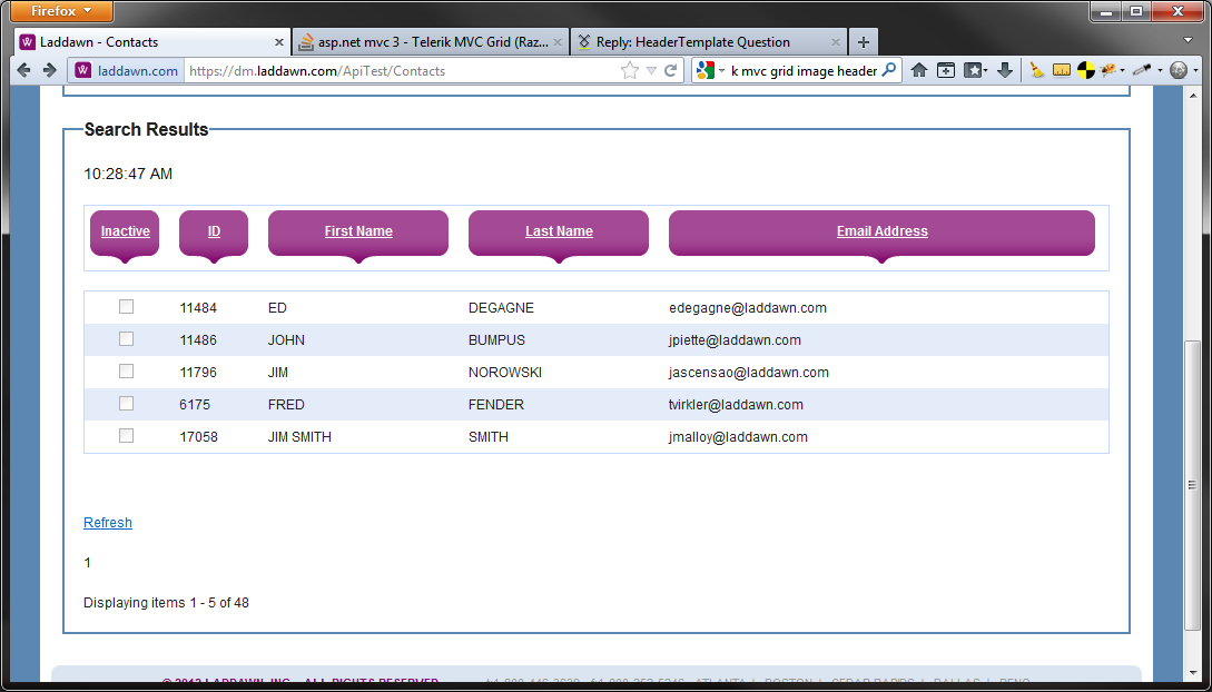 @Code 'declare the grid and enable features Dim contactsGrid = Html.Telerik().Grid(Model.Contacts). Name("Contacts"). Pageable(Function(p) p.PageSize(5)). Scrollable(). Sortable() With contactsGrid .DataKeys(Function(key) key.Add(Function(contact) contact.ID)) .Columns(Function(columns) columns.Bound(Function(contact) contact.Inactive). HeaderTemplate(String.Format("<div class=""{0}""></div><div class=""{1}"" style=""{2}""><a href=""#"" class=""t-link"">{3}</a></div><div class=""{4}""></div>", "gridHeaderLeft", "gridHeaderCenter", "width: 44px !important;", "Inactive", "gridHeaderRight")). HtmlAttributes(New With {.style = "text-align:center"}). HeaderHtmlAttributes(New With {.style = "text-align:center"}). Title("Inactive"). Width(80)) .Columns(Function(columns) columns.Bound(Function(contact) contact.ID). HeaderTemplate(String.Format("<div class=""{0}""></div><div class=""{1}"" style=""{2}""><a href=""#"" class=""t-link"">{3}</a></div><div class=""{4}""></div>", "gridHeaderLeft", "gridHeaderCenter", "width: 44px !important;", "ID", "gridHeaderRight")). Title("Id"). Width(80)) .Columns(Function(columns) columns.Bound(Function(contact) contact.FirstName). HeaderTemplate(String.Format("<div class=""{0}""></div><div class=""{1}"" style=""{2}""><a href=""#"" class=""t-link"">{3}</a></div><div class=""{4}""></div>", "gridHeaderLeft", "gridHeaderCenter", "width: 144px !important;", "First Name", "gridHeaderRight")). Title("First Name"). Width(180)) .Columns(Function(columns) columns.Bound(Function(contact) contact.LastName). HeaderTemplate(String.Format("<div class=""{0}""></div><div class=""{1}"" style=""{2}""><a href=""#"" class=""t-link"">{3}</a></div><div class=""{4}""></div>", "gridHeaderLeft", "gridHeaderCenter", "width: 144px !important;", "Last Name", "gridHeaderRight")). Title("Last Name"). Width(180)) .Columns(Function(columns) columns.Bound(Function(contact) contact.EmailAddress). HeaderTemplate(String.Format("<div class=""{0}""></div><div class=""{1}"" style=""{2}""><a href=""#"" class=""t-link"">{3}</a></div><div class=""{4}""></div>", "gridHeaderLeft", "gridHeaderCenter", "width: 365px !important;", "Email Address", "gridHeaderRight")). Title("Email Address")) .Render() End With End code