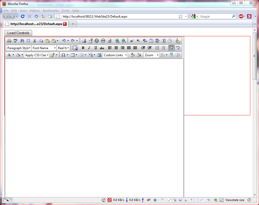 <%@ Page Language="VB" AutoEventWireup="false" CodeFile="Default.aspx.vb" Inherits="_Default" %><%@ Register Namespace="Telerik.Web.UI" Assembly="Telerik.Web.UI" TagPrefix="telerik" %><script runat="server" language="vbscript"> Protected Sub btn_Click(ByVal sender As Object, ByVal e As System.EventArgs) Handles btn.Click Dim div As New HtmlGenericControl("div") div.Style("height") = "300px" div.Style("border") = "1px solid #f00" Dim edt As New RadEditor() edt.Height = Unit.Pixel(300) edt.OnClientLoad = "function(editor,args){ editor.set_mode(1); }" div.Controls.Add(edt) pnl.Controls.Add(div) End Sub</script><!DOCTYPE html PUBLIC "-//W3C//DTD XHTML 1.0 Transitional//EN" "http://www.w3.org/TR/xhtml1/DTD/xhtml1-transitional.dtd"><html xmlns="http://www.w3.org/1999/xhtml"><head runat="server"> <title></title></head><body> <form id="form1" runat="server"> <asp:ScriptManager runat="server" /> <asp:Panel runat="server" ID="pnl"> <asp:Button runat="server" ID="btn" Text="Load Controls" /> </asp:Panel> <telerik:RadAjaxManager runat="server" DefaultLoadingPanelID="loading"> <AjaxSettings> <telerik:AjaxSetting AjaxControlID="pnl"> <UpdatedControls> <telerik:AjaxUpdatedControl ControlID="pnl" /> </UpdatedControls> </telerik:AjaxSetting> </AjaxSettings> </telerik:RadAjaxManager> <telerik:RadAjaxLoadingPanel runat="server" ID="loading"> Loading... </telerik:RadAjaxLoadingPanel> </form></body></html>Steps: