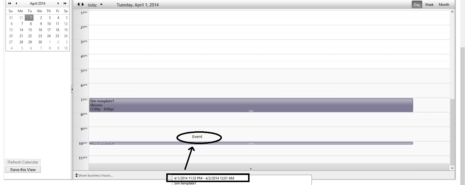a.First Event will be 1 April 2014 11.53 PM - 2 April 2014 12.01 AM