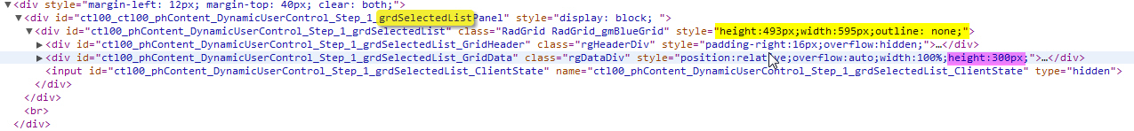 Generated HTML output of the Grid after; the height of outer div is still 493, but the rgDataDiv is now set to 300 px? Not sure where this comes from .