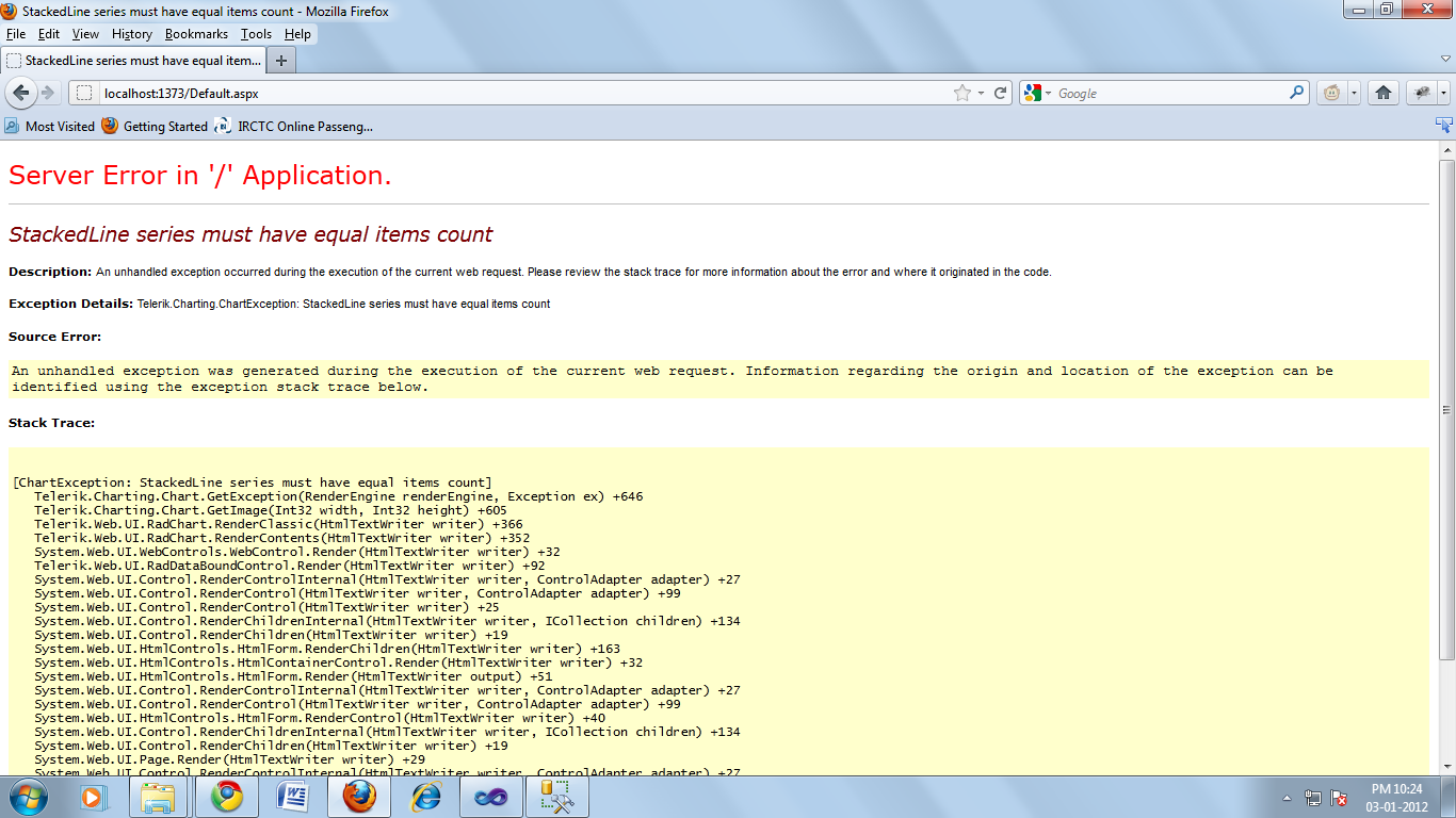 We are using telerik charting .We have used below code for generating chart.When we are using below code we get error in stack area and stack line chart.