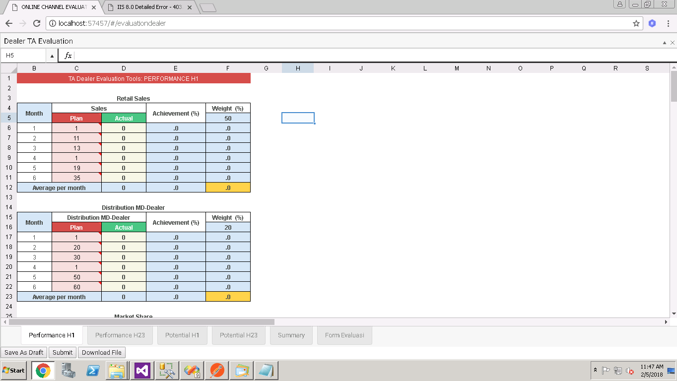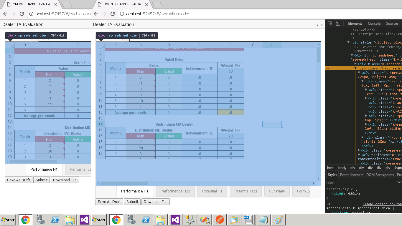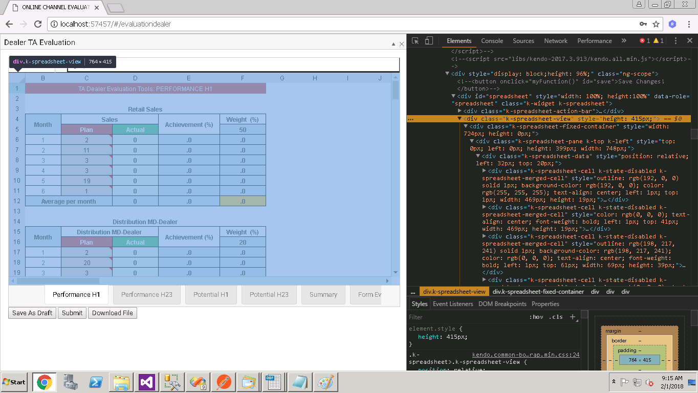 01.function initiateSheet(tipeLayanan){02. if(tipeLayanan=="H123"){03. pengangkatanStart = dummyGetObject.result.dealer.pengangkatanStart;04. //console.log("pengangkatanStart di JS: "+pengangkatanStart);05. createSheetConfigPerfH1("Performance H1");06. createSheetConfigPerfH23("Performance H23");07. createSheetConfigPotH1();08. createSheetConfigPotH23();09. createSheetConfigSummary();10. createSheetConfigEvalForm();11. $("#spreadsheet").kendoSpreadsheet({12. render: function(e){13. //Hides the insert button14. $(".k-spreadsheet .k-spreadsheet-sheets-bar .k-button").hide();15. 16. //Hides the remove icon17. $(".k-spreadsheet .k-spreadsheet-sheets-bar .k-spreadsheet-sheets-remove").hide();18. },19. toolbar:false,20. sheets:[sheetPerformanceH1,sheetPerformanceH23,sheetPotentialH1,sheetPotentialH23,sheetSummary,sheetEvaluationForm],21. pdf: {22. size: "auto",23. area: "sheet",24. landscape: false,25. fitWidth: true,26. hCenter: true,27. vCenter: false,28. fileName: dummyGetObject.result.dealer.dealerCode+"_Evaluation Dealer TA.pdf",29. guidelines: false,30. margin: {31. left: 25,32. right: 40,33. top: 20,34. bottom: 2035. }36. }37. });38. createSummary();39. }40.}