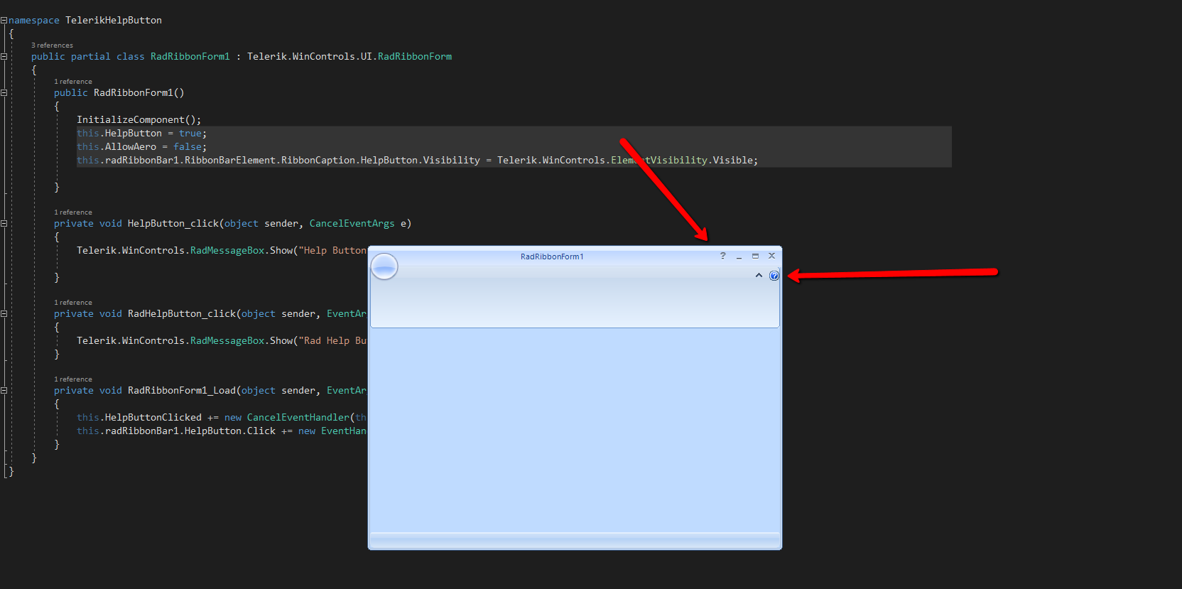 Private Sub FrmMain_Load(sender As Object, e As EventArgs) AddHandler RadRibbonBar1.HelpButton.Click, AddressOf RibbonBtn_Help_ClickEnd SubPrivate Sub RibbonBtn_Help_Click(sender As Object, e As EventArgs)'----Bla blaEnd Sub