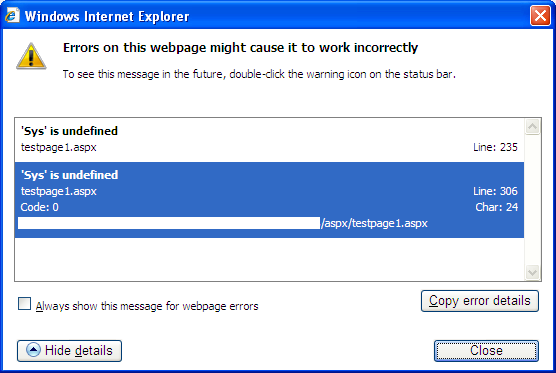 I tried with all the changes That i can and unable to solve this issue. You can view the pic. Which shows the view of the page with clienterror at the bottom of the browser which says "Sys is undefined".