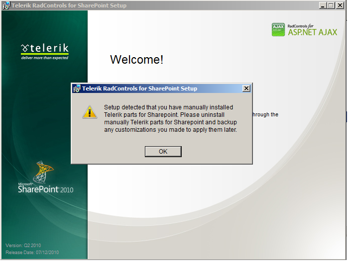 "Setup detected that you have manually installed Telerik parts for Sharepoint. Please uninstall manually Telerik parts for Sharepoint and backup any customizations you made to apply them Later."