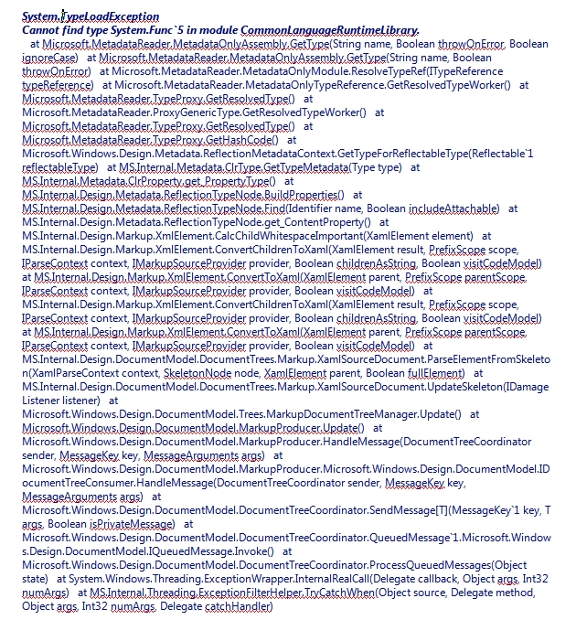 The exception: System.TypeLoadException -> Cannot find type System.Func`5 in module CommonLanguageRuntimeLibrary.