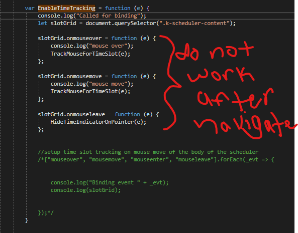 The problem is that when I navigate to a different day I can't re-bind the mouse move event. My code looks as follows, any help would be greatly appreciated.