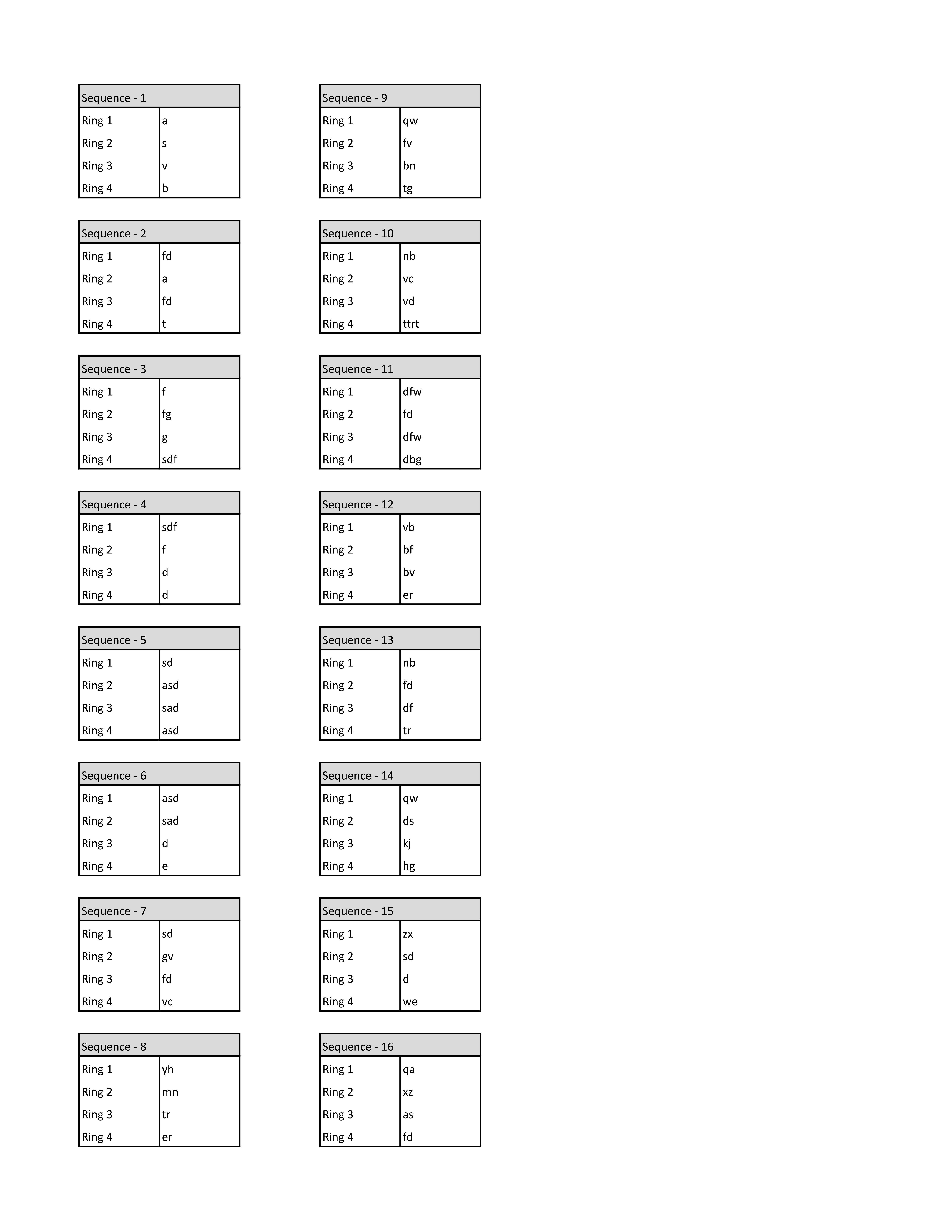 {int id, int ring, string phase} where id=1, 2, ..., 16, ring=1,2,3,4, phase = short string