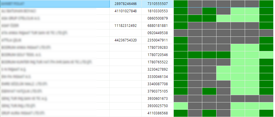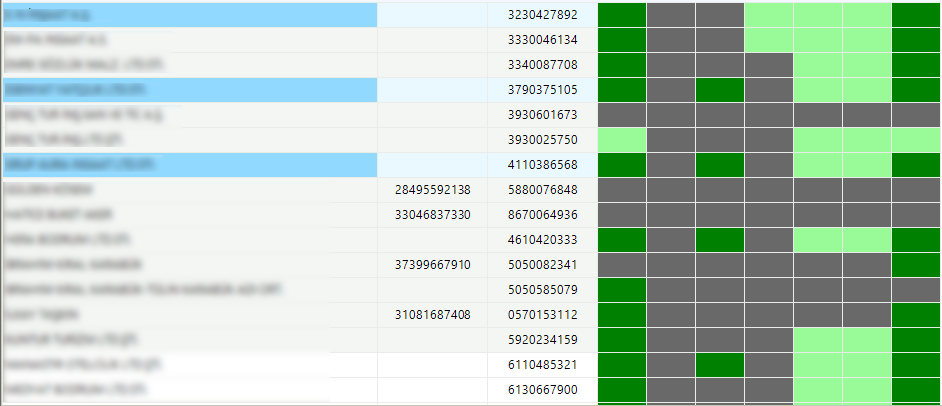 Private Sub rgw1_CellFormatting(sender As Object, e As CellFormattingEventArgs) Handles rgw1.CellFormatting Try If Not IsNothing(e) Then If Not IsNothing(e.CellElement.RowInfo.Cells("mukellef_mukellefiyetler")) Then Dim Turu2() As String = e.CellElement.RowInfo.Cells("mukellef_mukellefiyetler").ToString.Split("|") Dim Turu As String = "" Dim muhdonem As String = "" If Turu2(2) <> "H" Or Turu2(2) <> "" Then muhdonem = Turu2(2) e.CellElement.DrawFill = True Select Case e.Column.Name Case "listeler_kesin" If Turu2(7) = "H" Then e.CellElement.BackColor = Color.DimGray e.CellElement.ForeColor = Color.DimGray Else Turu = e.CellElement.RowInfo.Cells("listeler_kesin_aciklama").ToString.Split("|")(0) Select Case Turu Case "Onaylandı-Gönderildi" e.CellElement.BackColor = Color.Green e.CellElement.ForeColor = Color.Green Case "Onaylandı" e.CellElement.BackColor = Color.PaleGreen e.CellElement.ForeColor = Color.PaleGreen Case "Onaylanmadı" e.CellElement.BackColor = Color.Red e.CellElement.ForeColor = Color.Red Case "Bu Ay Yok" e.CellElement.BackColor = Color.DimGray e.CellElement.ForeColor = Color.DimGray End Select End If Case "listeler_formba" If Turu2(4) = "H" Then e.CellElement.BackColor = Color.DimGray e.CellElement.ForeColor = Color.DimGray Else Turu = e.CellElement.RowInfo.Cells("listeler_formba_aciklama").ToString.Split("|")(0) Select Case Turu Case "Onaylandı-Gönderildi" e.CellElement.BackColor = Color.Green e.CellElement.ForeColor = Color.Green Case "Onaylandı" e.CellElement.BackColor = Color.PaleGreen e.CellElement.ForeColor = Color.PaleGreen Case "Onaylanmadı" e.CellElement.BackColor = Color.Red e.CellElement.ForeColor = Color.Red Case "Bu Ay Yok" e.CellElement.BackColor = Color.DimGray e.CellElement.ForeColor = Color.DimGray End Select End If Case "listeler_formbs" If Turu2(4) = "H" Then e.CellElement.BackColor = Color.DimGray e.CellElement.ForeColor = Color.DimGray Else Turu = e.CellElement.RowInfo.Cells("listeler_formbs_aciklama").ToString.Split("|")(0) Select Case Turu Case "Onaylandı-Gönderildi" e.CellElement.BackColor = Color.Green e.CellElement.ForeColor = Color.Green Case "Onaylandı" e.CellElement.BackColor = Color.PaleGreen e.CellElement.ForeColor = Color.PaleGreen Case "Onaylanmadı" e.CellElement.BackColor = Color.Red e.CellElement.ForeColor = Color.Red Case "Bu Ay Yok" e.CellElement.BackColor = Color.DimGray e.CellElement.ForeColor = Color.DimGray End Select End If Case "listeler_kdv2" If Turu2(1) = "H" Then e.CellElement.BackColor = Color.DimGray e.CellElement.ForeColor = Color.DimGray Else Turu = e.CellElement.RowInfo.Cells("listeler_kdv2_aciklama").ToString.Split("|")(0) Select Case Turu Case "Onaylandı-Gönderildi" e.CellElement.BackColor = Color.Green e.CellElement.ForeColor = Color.Green Case "Onaylandı" e.CellElement.BackColor = Color.PaleGreen e.CellElement.ForeColor = Color.PaleGreen Case "Onaylanmadı" e.CellElement.BackColor = Color.Red e.CellElement.ForeColor = Color.Red Case "Bu Ay Yok" e.CellElement.BackColor = Color.DimGray e.CellElement.ForeColor = Color.DimGray End Select End If Case "listeler_kdv1" If Turu2(0) = "H" Then e.CellElement.BackColor = Color.DimGray e.CellElement.ForeColor = Color.DimGray Else Turu = e.CellElement.RowInfo.Cells("listeler_kdv1_aciklama").ToString.Split("|")(0) Select Case Turu Case "Onaylandı-Gönderildi" e.CellElement.BackColor = Color.Green e.CellElement.ForeColor = Color.Green Case "Onaylandı" e.CellElement.BackColor = Color.PaleGreen e.CellElement.ForeColor = Color.PaleGreen Case "Onaylanmadı" e.CellElement.BackColor = Color.Red e.CellElement.ForeColor = Color.Red Case "Bu Ay Yok" e.CellElement.BackColor = Color.DimGray e.CellElement.ForeColor = Color.DimGray End Select End If Case "listeler_muh" If Turu2(2) = "H" Then e.CellElement.BackColor = Color.DimGray e.CellElement.ForeColor = Color.DimGray Else If Not ucaylikdonem And muhdonem = "3" Then e.CellElement.BackColor = Color.DimGray e.CellElement.ForeColor = Color.DimGray Else Turu = e.CellElement.RowInfo.Cells("listeler_muh_aciklama").ToString.Split("|")(0) Select Case Turu Case "Onaylandı-Gönderildi" e.CellElement.BackColor = Color.Green e.CellElement.ForeColor = Color.Green Case "Onaylandı" e.CellElement.BackColor = Color.PaleGreen e.CellElement.ForeColor = Color.PaleGreen Case "Onaylanmadı" e.CellElement.BackColor = Color.Red e.CellElement.ForeColor = Color.Red Case "Bu Ay Yok" e.CellElement.BackColor = Color.DimGray e.CellElement.ForeColor = Color.DimGray End Select End If End If Case "listeler_gecici" If Turu2(5) = "H" Then e.CellElement.BackColor = Color.DimGray e.CellElement.ForeColor = Color.DimGray Else Turu = e.CellElement.RowInfo.Cells("listeler_gecici_aciklama").ToString.Split("|")(0) Select Case Turu Case "Onaylandı-Gönderildi" e.CellElement.BackColor = Color.Green e.CellElement.ForeColor = Color.Green Case "Onaylandı" e.CellElement.BackColor = Color.PaleGreen e.CellElement.ForeColor = Color.PaleGreen Case "Onaylanmadı" e.CellElement.BackColor = Color.Red e.CellElement.ForeColor = Color.Red Case "Bu Ay Yok" e.CellElement.BackColor = Color.DimGray e.CellElement.ForeColor = Color.DimGray End Select End If Case "listeler_yillik" If Turu2(6) = "H" Then e.CellElement.BackColor = Color.DimGray e.CellElement.ForeColor = Color.DimGray Else Turu = e.CellElement.RowInfo.Cells("listeler_yillik_aciklama").ToString.Split("|")(0) Select Case Turu Case "Onaylandı-Gönderildi" e.CellElement.BackColor = Color.Green e.CellElement.ForeColor = Color.Green Case "Onaylandı" e.CellElement.BackColor = Color.PaleGreen e.CellElement.ForeColor = Color.PaleGreen Case "Onaylanmadı" e.CellElement.BackColor = Color.Red e.CellElement.ForeColor = Color.Red Case "Bu Ay Yok" e.CellElement.BackColor = Color.DimGray e.CellElement.ForeColor = Color.DimGray End Select End If Case "listeler_damga" If Turu2(3) = "H" Then e.CellElement.BackColor = Color.DimGray e.CellElement.ForeColor = Color.DimGray Else Turu = e.CellElement.RowInfo.Cells("listeler_damga_aciklama").ToString.S