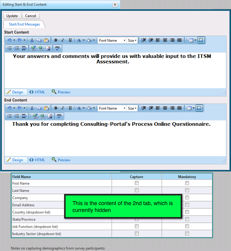 <FormTemplate> <div id="divEdit" runat="server" class="formTemplate" style="height: 520px;"> <div style="margin-bottom: 4px;"> <telerik:RadButton ID="btnQSAddUpdate" runat="server" Text="Update" CommandName="Update"> </telerik:RadButton> <telerik:RadButton ID="btnQSCancel" runat="server" Text="Cancel" CausesValidation="False" CommandName="Cancel"> </telerik:RadButton> </div> <telerik:RadTabStrip runat="server" ID="tabTaskJournal" MultiPageID="Multipage1" SelectedIndex="0"> <Tabs> <telerik:RadTab runat="server" ID="tabMessages" Text="Start/End Messages" PageViewID="pagMessages" Selected="true"> </telerik:RadTab> <telerik:RadTab runat="server" ID="tabDemographics" Text="Demographics" PageViewID="pagDemographics" OnPreRender="tabDemographics_PreRender"> </telerik:RadTab> </Tabs> </telerik:RadTabStrip> <telerik:RadMultiPage runat="server" ID="Multipage1" SelectedIndex="0" RenderSelectedPageOnly="false"> <telerik:RadPageView runat="server" ID="pagMessages"> <table class="formTemplateTable"> <tr> <td style="width: 30%;"> </td> </tr> <tr> <td style="text-align: left;"> <asp:Label ID="lblBegin" runat="server" ToolTip="Specify the start message that will appear at the beginning of the assessment" Text="Start Content" Font-Size="Small" Font-Bold="true"></asp:Label> <asp:RequiredFieldValidator ID="valStartMsg" runat="server" ControlToValidate="edtBeginMsgRichText" ErrorMessage="** REQUIRED **"></asp:RequiredFieldValidator> </td> </tr> <tr> <td> <telerik:RadEditor EnableEmbeddedSkins="true" Skin="Vista" ID="edtBeginMsgRichText" runat="server" EnableAjaxSkinRendering="true" Content='<%# Bind("BeginContent") %>' Width="740px" Height="200px" ImageManager-ViewPaths='<%# (string[])Session["currentCustomerImagesViewPath"] %>' ImageManager-UploadPaths='<%# (string[])Session["currentCustomerImagesUploadPath"] %>' ExternalDialogsPath="~/EditorDialogs" ToolTip="Specify the start message that will appear at the beginning of the assessment"> <Tools> <telerik:EditorToolGroup Tag="MainToolbar"> <telerik:EditorSplitButton Name="Undo"> </telerik:EditorSplitButton> <telerik:EditorSplitButton Name="Redo"> </telerik:EditorSplitButton> <telerik:EditorSeparator /> <telerik:EditorTool Name="Cut" /> <telerik:EditorTool Name="Copy" /> <telerik:EditorTool Name="Paste" ShortCut="CTRL+V" /> </telerik:EditorToolGroup> <telerik:EditorToolGroup Tag="Formatting"> <telerik:EditorTool Name="Bold" /> <telerik:EditorTool Name="Italic" /> <telerik:EditorTool Name="Underline" /> <telerik:EditorSeparator /> <telerik:EditorSplitButton Name="ForeColor"> </telerik:EditorSplitButton> <telerik:EditorSplitButton Name="BackColor"> </telerik:EditorSplitButton> <telerik:EditorSeparator /> <telerik:EditorDropDown Name="FontName"> </telerik:EditorDropDown> <telerik:EditorDropDown Name="FontSize"> </telerik:EditorDropDown> </telerik:EditorToolGroup> <telerik:EditorToolGroup Tag="Alignment"> <telerik:EditorTool Name="Indent" /> <telerik:EditorTool Name="Outdent" /> <telerik:EditorTool Name="JustifyLeft" /> <telerik:EditorTool Name="JustifyCenter" /> <telerik:EditorTool Name="JustifyRight" /> <telerik:EditorTool Name="JustifyFull" /> </telerik:EditorToolGroup> <telerik:EditorToolGroup Tag="Tables"> <telerik:EditorSeparator /> <telerik:EditorTool Name="InsertTable" /> <telerik:EditorTool Name="ToggleTableBorder" /> </telerik:EditorToolGroup> <telerik:EditorToolGroup Tag="Lists"> <telerik:EditorTool Name="InsertUnorderedList" /> <telerik:EditorTool Name="InsertOrderedList" /> <telerik:EditorTool Name="InsertHorizontalRule" /> </telerik:EditorToolGroup> <telerik:EditorToolGroup Tag="ImagesAndLinks"> <telerik:EditorTool Name="InsertLink" /> <telerik:EditorTool Name="Unlink" /> <telerik:EditorTool Name="ImageManager" /> </telerik:EditorToolGroup> <telerik:EditorToolGroup Tag="Spell"> <telerik:EditorTool Name="AjaxSpellCheck" /> </telerik:EditorToolGroup> </Tools> </telerik:RadEditor> </td> </tr> <tr> <td style="text-align: left;"> <asp:Label ID="Label1" runat="server" ToolTip="Specify the start message that will appear at the end of the assessment" Text="End Content" Font-Size="Small" Font-Bold="true"></asp:Label> <asp:RequiredFieldValidator ID="valEndMsg" runat="server" ControlToValidate="edtEndMsgRichText" ErrorMessage="** REQUIRED **"></asp:RequiredFieldValidator> </td> </tr> <tr> <td> <telerik:RadEditor EnableEmbeddedSkins="true" Skin="Vista" ID="edtEndMsgRichText" runat="server" EnableAjaxSkinRendering="true" Content='<%# Bind("EndContent") %>' Width="740px" Height="200px" ImageManager-ViewPaths='<%# (string[])Session["currentCustomerImagesViewPath"] %>' ImageManager-UploadPaths='<%# (string[])Session["currentCustomerImagesUploadPath"] %>' ExternalDialogsPath="~/EditorDialogs" ToolTip="Specify the start message that will appear at the end of the assessment"> <Tools> <telerik:EditorToolGroup Tag="MainToolbar"> <telerik:EditorSplitButton Name="Undo"> </telerik:EditorSplitButton> <telerik:EditorSplitButton Name="Redo"> </telerik:EditorSplitButton> <telerik:EditorSeparator /> <telerik:EditorTool Name="Cut" /> <telerik:EditorTool Name="Copy" /> <telerik:EditorTool Name="Paste" ShortCut="CTRL+V" /> </telerik:EditorToolGroup> <telerik:EditorToolGroup Tag="Formatting"> <telerik:EditorTool Name="Bold" /> <telerik:EditorTool Name="Italic" /> <telerik:EditorTool Name="Underline" /> <telerik:EditorSeparator /> <telerik:EditorSplitButton Name="ForeColor"> </telerik:EditorSplitButton> <telerik:EditorSplitButton Name="BackColor"> </telerik:EditorSplitButton> <telerik:EditorSeparator /> <telerik:EditorDropDown Name="FontName"> </telerik:EditorDropDown> <telerik:EditorDropDown Name="FontSize"> </telerik:EditorDropDown> </telerik:EditorToolGroup> <telerik:EditorToolGroup Tag="Alignment"> <telerik:EditorTool Name="Indent" /> <telerik:EditorTool Name="Outdent" /> <telerik:EditorTool Name="JustifyLeft" /> <telerik:EditorTool Name="JustifyCenter" /> <telerik:EditorTool Name="JustifyRight" /> <telerik:EditorTool Name="JustifyFull" /> </telerik:EditorToolGroup> <telerik:Edi