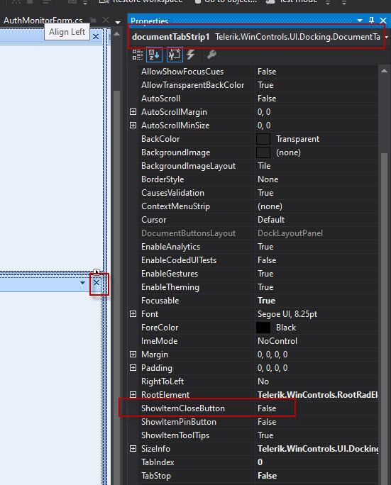 Note that the ShowDocumentCloseButton property controls the visibility of the close button displayed in each tab: