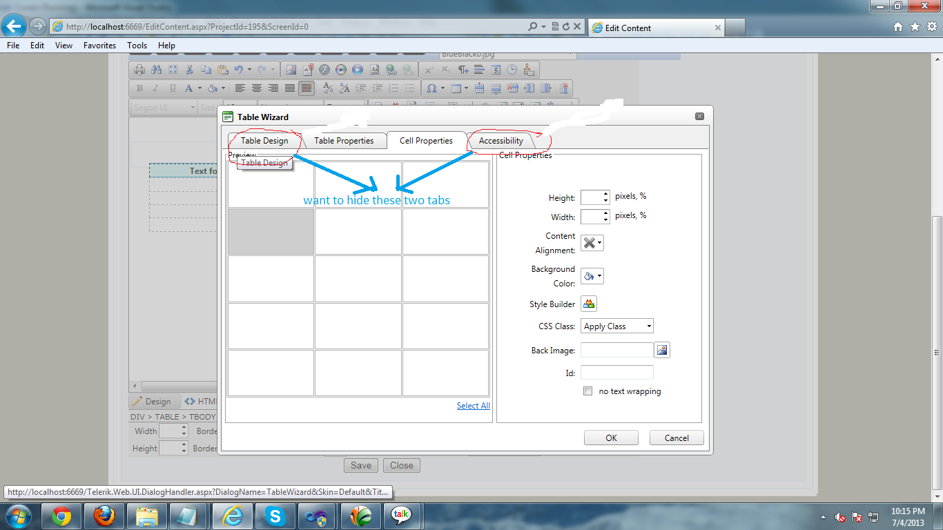 I am using Rad Editor in my project that I have created with VS2010. As per my project requirement, I want to show only two tabs in table wizard popup of Rad editor and want to hide another two Tabs simultaneously (Table properties and Accessibility). I have tried a lot to hide the tabs with overriding the Css and also from java script but I couldn't be able to solve this problem. Can you please, provide me any suggestion / help. I have also attached the screen shot related to my problem. Please, help me out.