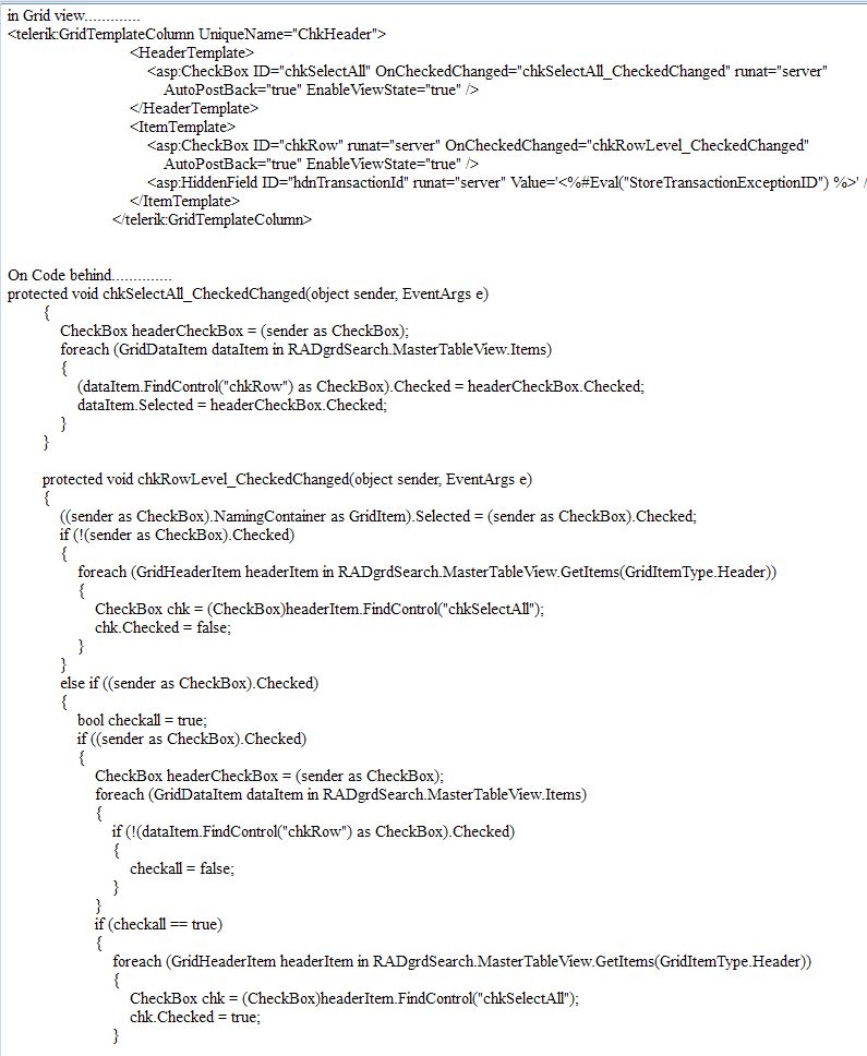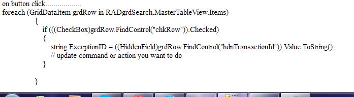 my requirement is to retrive the values of those whose checkboxes are check under a button click event in radgrid.. pls help me out