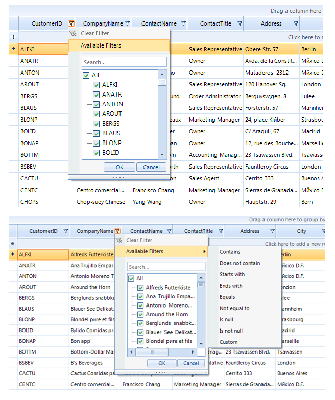 I'd like to be able to hide the Available Filters drop down list box for some GridView columns but not others when opening the Filter pop-up (Excel type filtering). Do you have some code I could use?
