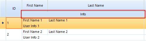 You can subscribe to ViewRowFormatting event and set the Visibility property of Info column to Collapsed and change the MinSize property of another 2 columns (FirstName and LastName). You can use the following code snippet: