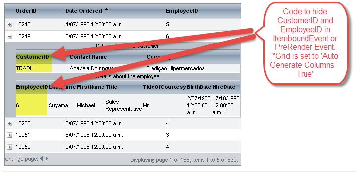 The issue is that I can't figure out the code to hide the EmployeeID in the 2nd details table on the same hierarchy level of the radgrid. Please Help!