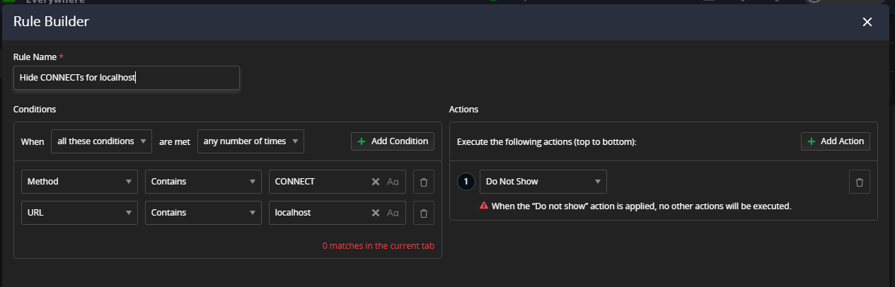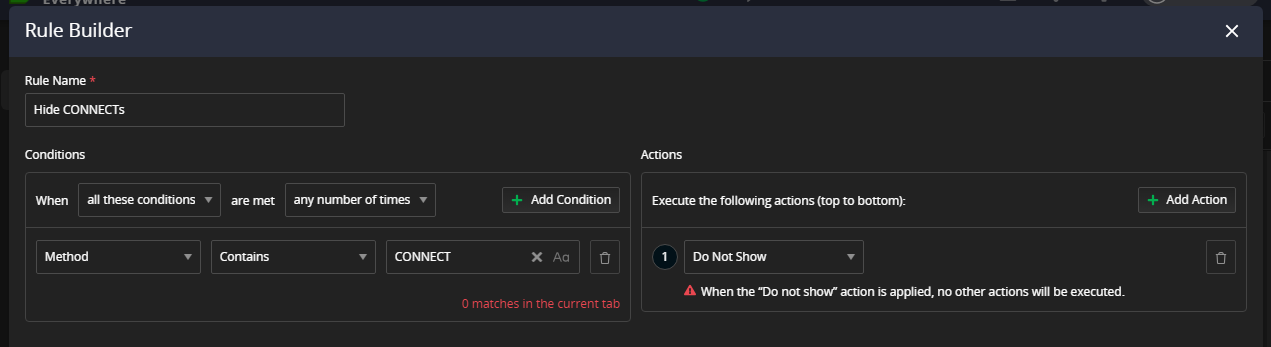 Fiddler Classic has a "Hide CONNECT" feature that I find very useful for eliminating TLS negotiation clutter. In Fiddler Everywhere, I can achieve the similar effect by using a filter. However, this does not work when I also have to use OR conditions to filter out traffic from multiple hosts.
