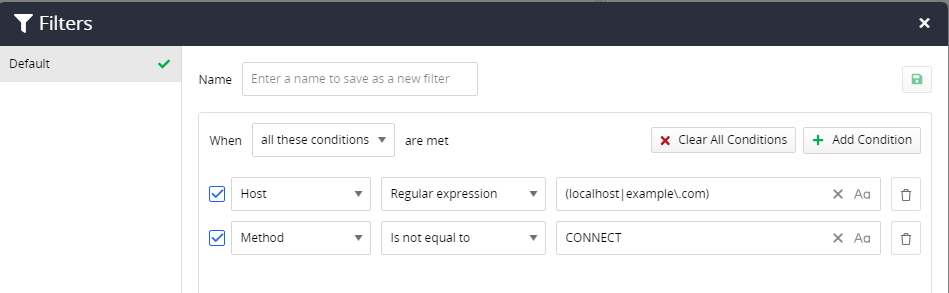 More generally, it seems that mixed-mode filter that supports both AND and OR may be required. In this specific case, the filter conditions needed would be "Method != CONNECT && (Host == localhost || Host == example.com)".