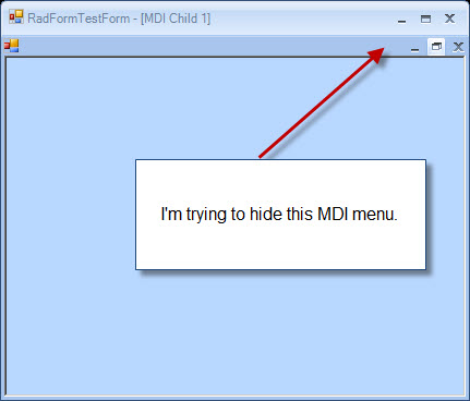 I'm using a RadForm as an MDI container and loading child MDI forms into it. I load the child forms in a maximized state but seem to be unable to hide the default MDI menu in the parent form.