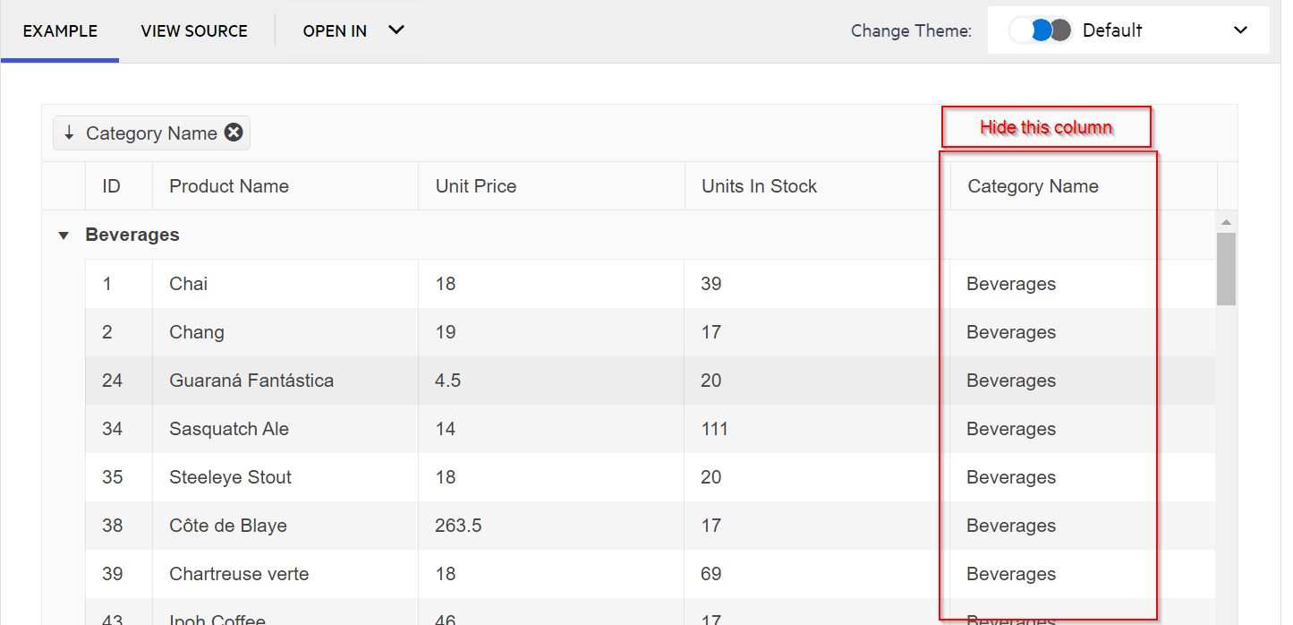 How to hide the grouped columns automatically in grid? After a column is grouped (by dragging and dropped into the drag and drop area), I want to hide the columns that have been grouped. See the attached screenshot.
