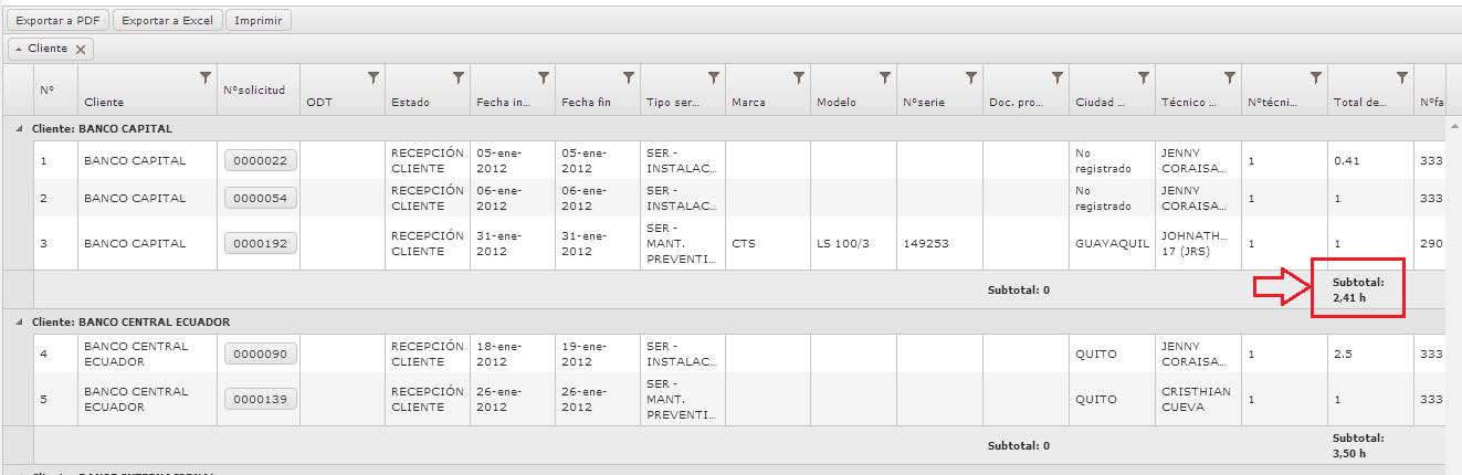 @(Html.Kendo().Grid(Model) .Name("Grid") .Columns(columns => { columns.Template(t => { }).Title("N°").ClientTemplate("#= renderRecordNumber(data) #").Width(40); columns.Bound(p => p.ID_SOLICITUDSERVICIO).Visible(false); columns.Bound(p => p.ID_PARTESERVICIO).Visible(false); columns.Bound(p => p.NOMBRE_EMPRESA).Title("Cliente"); columns.Command(command => command.Custom("custom").Text("").Click("MostrarSolicitud")).Title("N°solicitud").Width(75); columns.Bound(p => p.SOLICITUD_CLIENTE).Title("ODT"); columns.Bound(p => p.NOMBRE_ESTADOSOLICITUD).Title("Estado"); columns.Bound(p => p.SFECHA_INICIO).Title("Fecha inicio"); columns.Bound(p => p.SFECHA_FIN).Title("Fecha fin"); //columns.Bound(p => p.SHORA_INICIO).Title("Hora inicio"); //columns.Bound(p => p.SHORA_FIN).Title("Hora fin"); columns.Bound(p => p.NOMBRE_TIPOSERVICIO).Title("Tipo servicio"); columns.Bound(p => p.NOMBRE_MARCA).Title("Marca"); columns.Bound(p => p.NOMBRE_MODELO).Title("Modelo"); columns.Bound(p => p.SERIE_INVENTARIO).Title("N°serie"); columns.Bound(p => p.DOCUMENTOS_PROCESADOS).Title("Doc. procesados") .ClientFooterTemplate("Total: #=sum#") .ClientGroupFooterTemplate("Subtotal: #=sum#"); columns.Bound(p => p.NOMBRE_UBICACION).Title("Ciudad Atención"); columns.Bound(p => p.TECNICO_RESPONSABLE).Title("Técnico responsable"); columns.Bound(p => p.NUMERO_TECNICOS).Title("N°técnicos"); columns.Bound(p => p.TOTAL_HORAS).Title("Total de horas") .ClientFooterTemplate("Total: #=kendo.toString(sum, 'n2')# h") .ClientGroupFooterTemplate("Subtotal: #=kendo.toString(sum, 'n2')# h"); columns.Bound(p => p.FACTURA_PARTESERVICIO).Title("N°factura"); }) .Sortable() .Pageable(m => m.PageSizes(new int[] { 10, 20, 50, 100 })) .Groupable() .Filterable() .Events(e => { e.DataBound("dataBound"); }) .Scrollable(s => s.Height("auto")) .TableHtmlAttributes(new { style = "table-layout: fixed;" }) .Resizable(r => r.Columns(true)) .DataSource(dataSource => dataSource .Ajax() .Events(ev => { ev.RequestStart("Load"); ev.RequestEnd("Ready"); }) .Aggregates(aggregates => { aggregates.Add(m => m.DOCUMENTOS_PROCESADOS).Sum(); aggregates.Add(m => m.TOTAL_HORAS).Sum(); }) .Read(read => read.Action("LeerExt_MatrizServicios", "Consultas").Data("getParameter")) ) .ToolBar(toolBar => toolBar.Custom() .Text("Exportar a PDF") .HtmlAttributes(new { id = "export" }) .Url(Url.Action("ExportarPDFMatrizServicios", "Consultas", new { page = 1, pageSize = "~", filter = "~", sort = "~", txtFechaInicio = "~", txtFechaFin = "~", txtHoraInicio1 = "~", txtHoraInicio2 = "~", id_procedenciaequipo = "0", id_cliente = "0", id_localidadequipo = "0", id_unidadnegocio = "0", id_tecnico = "0", varios_tecnicos = "0", id_tiposervicio = "0", id_marca = "0", id_modelo = "0", id_serieequipo = "0", id_estadosolicitud = "0", id_tipoatencion = "0", id_bodega = "0", uso_repuesto = "0", id_repuesto = "0", AtencionMayor = " ", AtencionMenor = " ", partes_facturados = " ", id_tecnico_involucrado = "0", nombre_cliente = " ", nombre_tecnico = " ", nombre_servicio = " ", estado_solicitud = " ", nombre_tecnico_involucrado = " ", unidad_negocio = " " })) ) .ToolBar(toolBar => toolBar.Custom() .Text("Exportar a Excel") .HtmlAttributes(new { id = "exportex" }) .Url(Url.Action("ExportarExcelMatrizServicios", "Consultas", new { page = 1, pageSize = "~", filter = "~", sort = "~", txtFechaInicio = "~", txtFechaFin = "~", txtHoraInicio1 = "~", txtHoraInicio2 = "~", id_procedenciaequipo = "0", id_cliente = "0", id_localidadequipo = "0", id_unidadnegocio = "0", id_tecnico = "0", varios_tecnicos = "0", id_tiposervicio = "0", id_marca = "0", id_modelo = "0", id_serieequipo = "0", id_estadosolicitud = "0", id_tipoatencion = "0", id_bodega = "0", uso_repuesto = "0", id_repuesto = "0", AtencionMayor = " ", AtencionMenor = " ", partes_facturados = " ", id_tecnico_involucrado = "0", nombre_cliente = " ", nombre_tecnico = " ", nombre_servicio = " ", estado_solicitud = " ", nombre_tecnico_involucrado = " ", unidad_negocio = " " })) ) .ToolBar(toolBar => toolBar.Custom().Text("Imprimir").Url("#").HtmlAttributes(new { @class = "btnImprimir" })) )Thanks for the help I hope it's possible