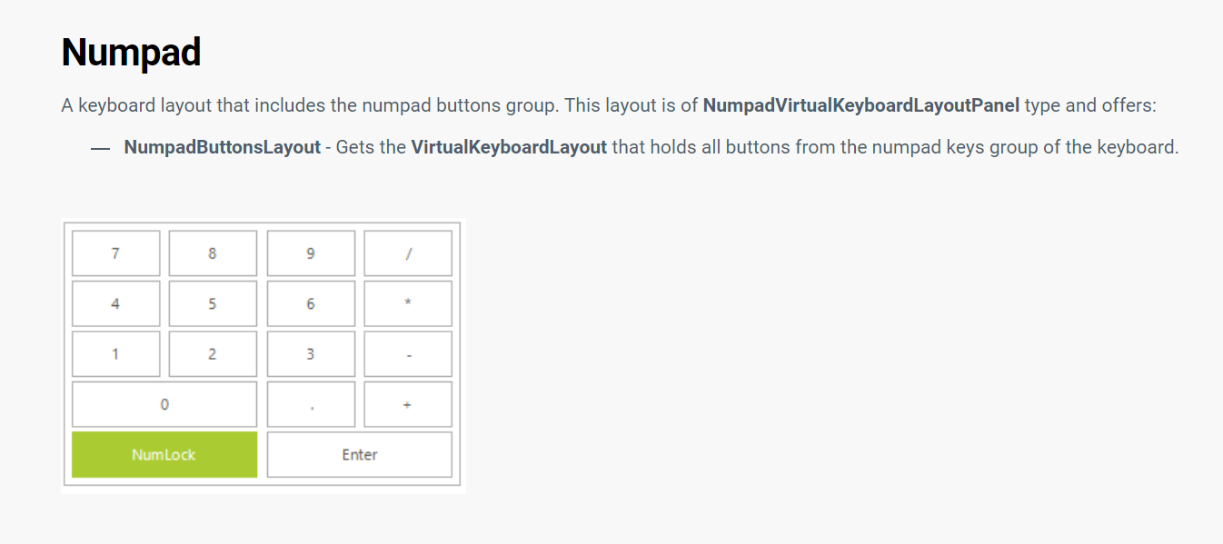 Setting the KeyboardForm.VirtualKeyboard.LayoutType property to KeyboardLayoutType.Numpad produces the following result on my end: