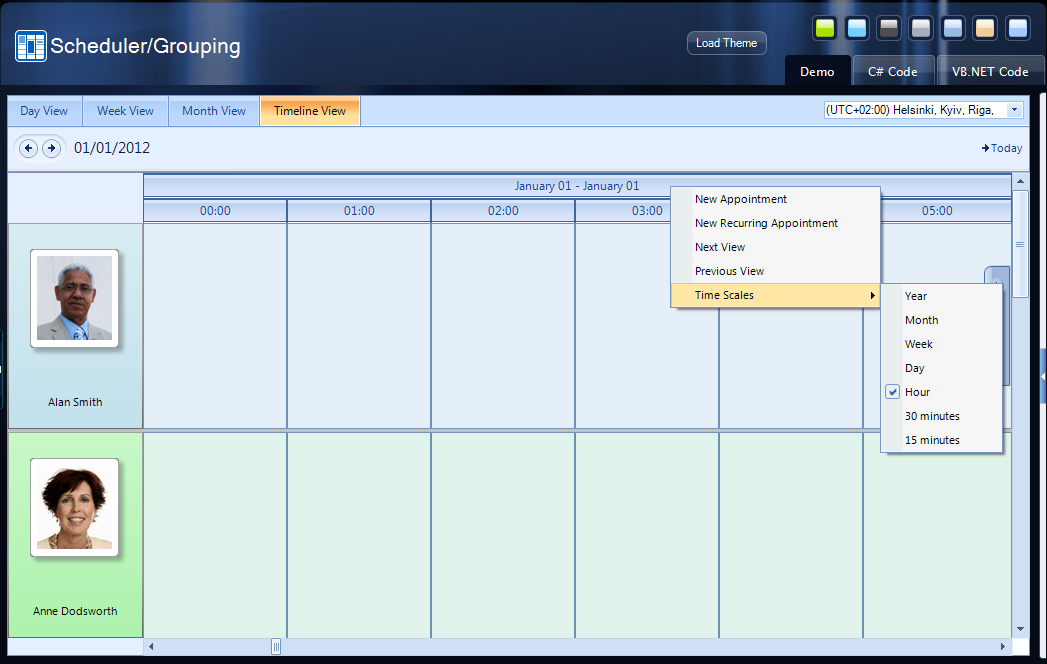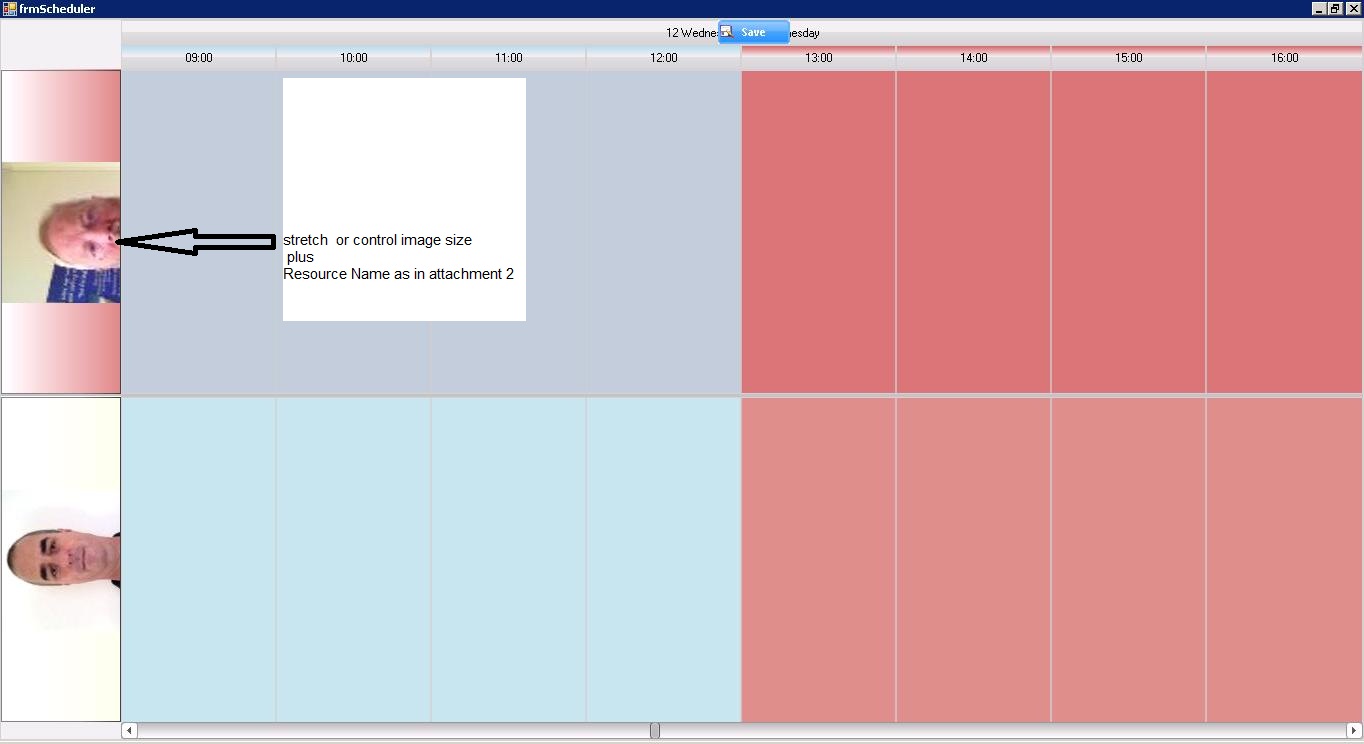 Private Sub radScheduler1_CellFormatting(sender As Object, e As Telerik.WinControls.UI.SchedulerCellEventArgs) Handles radScheduler1.CellFormatting If e.CellElement.[Date].Hour >= 12 AndAlso e.CellElement.[Date].Hour <= 14 Then e.CellElement.BackColor = Color.Green ElseIf e.CellElement.IsWorkTime Then e.CellElement.BackColor = Color.Red Else e.CellElement.ResetValue(SchedulerCellElement.BackColorProperty, Telerik.WinControls.ValueResetFlags.Local) End IfEnd SubAs to the orientation of resources/time scale in grouped DayView, it cannot be modified. However, you can use the TimelineView which arranges the resources vertically and the timescale horizontally. You can check the Grouping example in our Examples application. I have also attached a screenshot which demonstrates this.