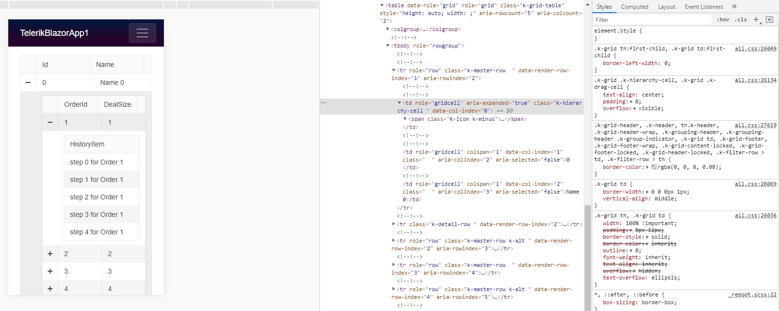 When setting the value of a class property .k-hierarchy-cell { display = none } the nested table does not fill the full width of the container
