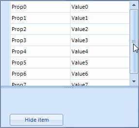 public Form1(){ InitializeComponent(); RadPropertyStore store = new RadPropertyStore(); for (int i = 0; i < 8; i++) { PropertyStoreItem item = new PropertyStoreItem(typeof(string), "Prop" + i, "Value" + i); store.Add(item); } this.radPropertyGrid1.SelectedObject = store;}private void radButton1_Click(object sender, EventArgs e){ this.radPropertyGrid1.PropertyGridElement.PropertyTableElement.BeginUpdate(); this.radPropertyGrid1.Items["Prop5"].Visible = false; this.radPropertyGrid1.PropertyGridElement.PropertyTableElement.EndUpdate();}I hope this information helps. Should you have further questions, I would be glad to help.