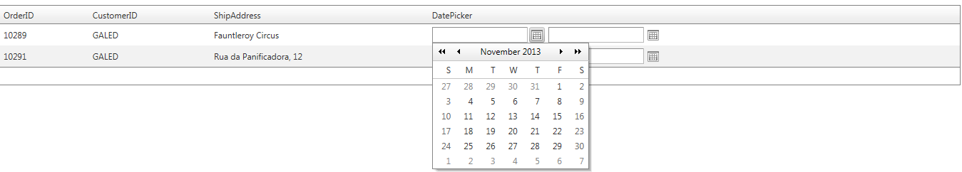 <telerik:RadGrid ID="RadGrid1" runat="server" DataSourceID="SqlDataSource1" AutoGenerateColumns="false" ShowFooter="true"> <MasterTableView> <Columns> <telerik:GridBoundColumn DataField="OrderID" UniqueName="OrderID" HeaderText="OrderID"> </telerik:GridBoundColumn> <telerik:GridBoundColumn DataField="CustomerID" UniqueName="CustomerID" HeaderText="CustomerID"> </telerik:GridBoundColumn> <telerik:GridBoundColumn DataField="ShipAddress" UniqueName="ShipAddress" HeaderText="ShipAddress"> </telerik:GridBoundColumn> <telerik:GridTemplateColumn HeaderText="DatePicker"> <ItemTemplate> <telerik:RadDatePicker ID="RadDatePicker1" runat="server"> </telerik:RadDatePicker> <telerik:RadDatePicker ID="RadDatePicker2" runat="server"> </telerik:RadDatePicker> </ItemTemplate> </telerik:GridTemplateColumn> </Columns> </MasterTableView></telerik:RadGrid><asp:SqlDataSource ID="SqlDataSource1" runat="server" ConnectionString="<%$ ConnectionStrings:NorthwindConnectionString %>" SelectCommand="SELECT top 2 [OrderID], [CustomerID], [ShipAddress] FROM [Orders]"></asp:SqlDataSource>Hope this will helps you.