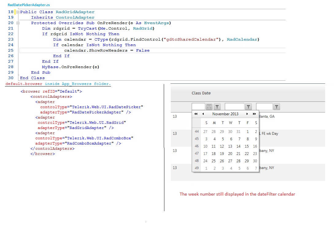 public class RadDatePickerAdapter : ControlAdapter{ protected override void OnLoad(EventArgs e) { var Calendar = this.Control as RadCalendar; if (Calendar != null) { Calendar.ShowRowHeaders = false; } base.OnLoad(e); }}default.browser :