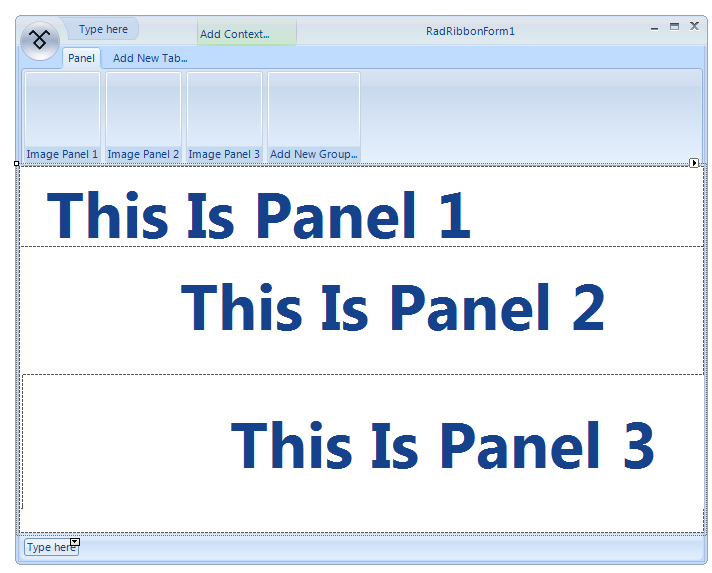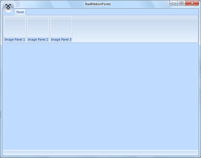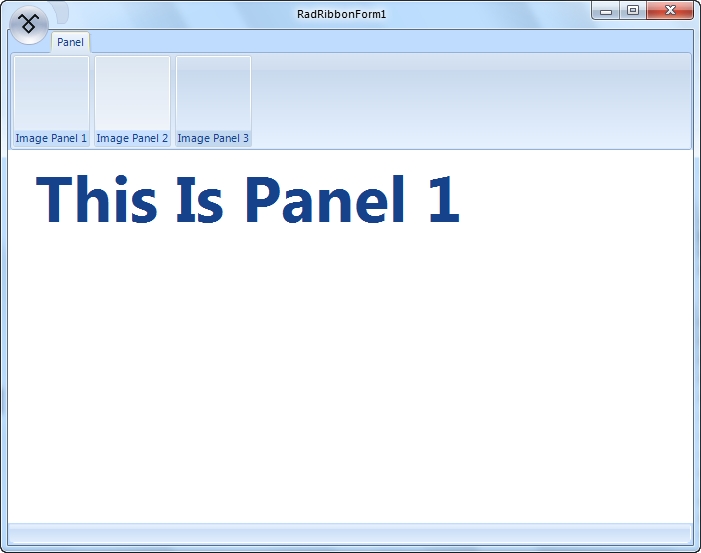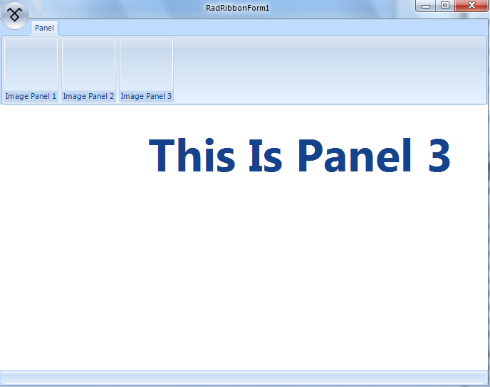 using System;public partial class RadRibbonForm1 : Telerik.WinControls.UI.RadRibbonForm{ public RadRibbonForm1() { InitializeComponent(); } private void radRibbonBarGroup1_Click(object sender, EventArgs e) { HideAllPanels(); radPanel1.Visible = true; } private void radRibbonBarGroup2_Click(object sender, EventArgs e) { HideAllPanels(); radPanel2.Visible = true; } private void radRibbonBarGroup3_Click(object sender, EventArgs e) { HideAllPanels(); radPanel3.Visible = true; } private void HideAllPanels() { radPanel1.Visible = false; radPanel2.Visible = false; radPanel3.Visible = false; } #region Designer Code /// <summary> /// Required designer variable. /// </summary> private System.ComponentModel.IContainer components = null; /// <summary> /// Clean up any resources being used. /// </summary> /// <param name="disposing">true if managed resources should be disposed; otherwise, false.</param> protected override void Dispose(bool disposing) { if (disposing && (components != null)) { components.Dispose(); } base.Dispose(disposing); } #region Windows Form Designer generated code /// <summary> /// Required method for Designer support - do not modify /// the contents of this method with the code editor. /// </summary> private void InitializeComponent() { System.ComponentModel.ComponentResourceManager resources = new System.ComponentModel.ComponentResourceManager(typeof(RadRibbonForm1)); this.radRibbonBar1 = new Telerik.WinControls.UI.RadRibbonBar(); this.radStatusStrip1 = new Telerik.WinControls.UI.RadStatusStrip(); this.panel1 = new System.Windows.Forms.Panel(); this.ribbonTab1 = new Telerik.WinControls.UI.RibbonTab(); this.radRibbonBarGroup1 = new Telerik.WinControls.UI.RadRibbonBarGroup(); this.radRibbonBarGroup2 = new Telerik.WinControls.UI.RadRibbonBarGroup(); this.radRibbonBarGroup3 = new Telerik.WinControls.UI.RadRibbonBarGroup(); this.radPanel1 = new Telerik.WinControls.UI.RadPanel(); this.radPanel2 = new Telerik.WinControls.UI.RadPanel(); this.radPanel3 = new Telerik.WinControls.UI.RadPanel(); ((System.ComponentModel.ISupportInitialize)(this.radRibbonBar1)).BeginInit(); ((System.ComponentModel.ISupportInitialize)(this.radStatusStrip1)).BeginInit(); this.panel1.SuspendLayout(); ((System.ComponentModel.ISupportInitialize)(this.radPanel1)).BeginInit(); ((System.ComponentModel.ISupportInitialize)(this.radPanel2)).BeginInit(); ((System.ComponentModel.ISupportInitialize)(this.radPanel3)).BeginInit(); ((System.ComponentModel.ISupportInitialize)(this)).BeginInit(); this.SuspendLayout(); // // radRibbonBar1 // this.radRibbonBar1.AutoSize = true; this.radRibbonBar1.CommandTabs.AddRange(new Telerik.WinControls.RadItem[] { this.ribbonTab1}); this.radRibbonBar1.Dock = System.Windows.Forms.DockStyle.Top; this.radRibbonBar1.EnableKeyMap = true; // // // // // // this.radRibbonBar1.ExitButton.ButtonElement.Class = "RadMenuButtonElement"; this.radRibbonBar1.ExitButton.ButtonElement.TextImageRelation = System.Windows.Forms.TextImageRelation.ImageBeforeText; this.radRibbonBar1.ExitButton.Text = "Exit"; this.radRibbonBar1.Location = new System.Drawing.Point(0, 0); this.radRibbonBar1.Name = "radRibbonBar1"; // // // // // // this.radRibbonBar1.OptionsButton.ButtonElement.Class = "RadMenuButtonElement"; this.radRibbonBar1.OptionsButton.ButtonElement.TextImageRelation = System.Windows.Forms.TextImageRelation.ImageBeforeText; this.radRibbonBar1.OptionsButton.Text = "Options"; // // // this.radRibbonBar1.RootElement.AutoSizeMode = Telerik.WinControls.RadAutoSizeMode.WrapAroundChildren; this.radRibbonBar1.Size = new System.Drawing.Size(474, 144); this.radRibbonBar1.StartButtonImage = ((System.Drawing.Image)(resources.GetObject("radRibbonBar1.StartButtonImage"))); this.radRibbonBar1.TabIndex = 0; this.radRibbonBar1.Text = "RadRibbonForm1"; // // radStatusStrip1 // this.radStatusStrip1.AutoSize = true; this.radStatusStrip1.LayoutStyle = Telerik.WinControls.UI.RadStatusBarLayoutStyle.Stack; this.radStatusStrip1.Location = new System.Drawing.Point(0, 397); this.radStatusStrip1.Name = "radStatusStrip1"; this.radStatusStrip1.Size = new System.Drawing.Size(474, 28); this.radStatusStrip1.SizingGrip = false; this.radStatusStrip1.TabIndex = 1; this.radStatusStrip1.Text = "radStatusStrip1"; // // panel1 // this.panel1.Controls.Add(this.radPanel3); this.panel1.Controls.Add(this.radPanel2); this.panel1.Controls.Add(this.radPanel1); this.panel1.Dock = System.Windows.Forms.DockStyle.Fill; this.panel1.Location = new System.Drawing.Point(0, 144); this.panel1.Name = "panel1"; this.panel1.Size = new System.Drawing.Size(474, 253); this.panel1.TabIndex = 2; // // ribbonTab1 // this.ribbonTab1.Alignment = System.Drawing.ContentAlignment.BottomLeft; // // ribbonTab1.ContentPanel // this.ribbonTab1.ContentPanel.BackColor = System.Drawing.SystemColors.ControlLightLight; this.ribbonTab1.ContentPanel.CausesValidation = true; this.ribbonTab1.ContentPanel.Font = new System.Drawing.Font("Microsoft Sans Serif", 8.25F, System.Drawing.FontStyle.Regular, System.Drawing.GraphicsUnit.Point, ((byte)(238))); this.ribbonTab1.ContentPanel.ForeColor = System.Drawing.SystemColors.ControlText; this.ribbonTab1.ContentPanel.Location = new System.Drawing.Point(0, 0); this.ribbonTab1.ContentPanel.Size = new System.Drawing.Size(200, 100); this.ribbonTab1.IsSelected = true; this.ribbonTab1.Items.AddRange(new Telerik.WinControls.RadItem[] { this.radRibbonBarGroup1, this.radRibbonBarGroup2, this.radRibbonBarGroup3}); this.ribbonTab1.Name = "ribbonTab1"; this.ribbonTab1.StretchHorizontally = false; this.ribbonTab1.Text = "Panels"; // // radRibbonBarGroup1 // this.radRibbonBarGroup1.Name = "radRibbonBarGroup1"; this.radRibbonBarGroup1.Text = "Panel1"; this.radRibbonBarGroup1.Click += new System.EventHandler(this.radRibbonBarGroup1_Click); // // radRibbonBarGroup2 // this.radRibbonBarGroup2.Name = "radRibbonBarGroup2"; this.radRibbonBarGroup2.Text = "Panel2"; this.radRibbonBarGroup2.Click += new System.EventHandler(this.radRibbonBarGroup2_Click); // // radRibbonBa