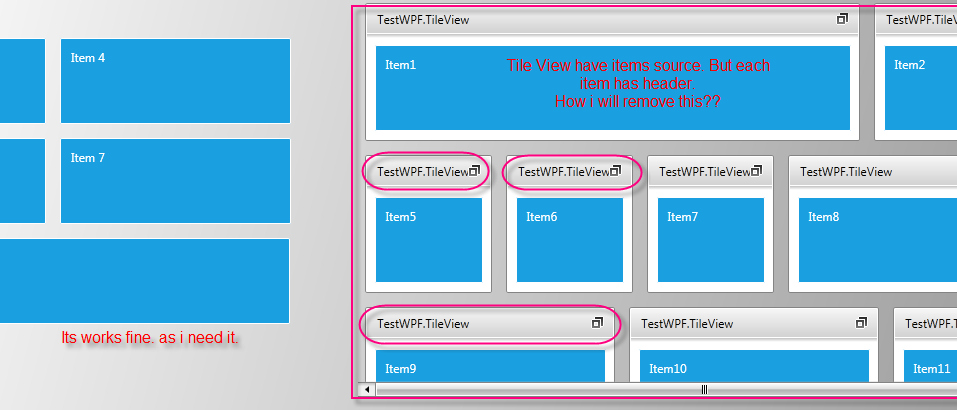 I have a RadTileView which bind to list. Problem is that i dont want any header (area, text, togglebutton). Please guide me through sample application. In attached image my problem may be more clear. on Left side i have a tile view (items source not bind) have individual tileviewitems. I got my desired result. How i will get such result if i bind items source to some collection. Here in example i only set contentTemplate. Can you tell me difference between content template and itemstemplate???