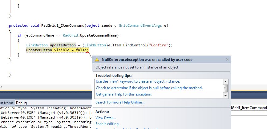 protected void RadGrid1_ItemCommand(object sender, GridCommandEventArgs e) { if (e.CommandName == RadGrid.UpdateCommandName) { LinkButton updateButton = (LinkButton)e.Item.FindControl("UpdateButton"); updateButton.Visible = false; }}Thanks,