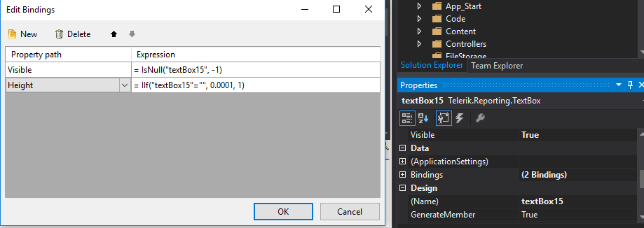 I've been having a ton of trouble hiding a row that is supposed to be empty inside a table, but that still shows up in the table when doing the report; I know this can be done using bindings but I'm not entirely sure if I'm implementing them right, I attached an image showing how I did it and I was hoping if anybody could confirm whether I did it right or not...