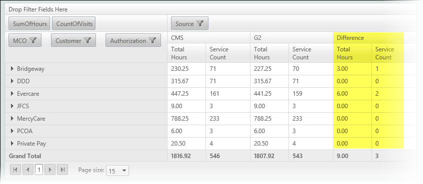 What I ended up with was using a PivotGridAggregateField field, "DifferenceInHoursFromCMS", with a TotalFunction of "DifferenceFrom". The problem I am having with this is that it leaves this empty column in the output (seen in attached screenshot). Is there any way to hide that empty column?