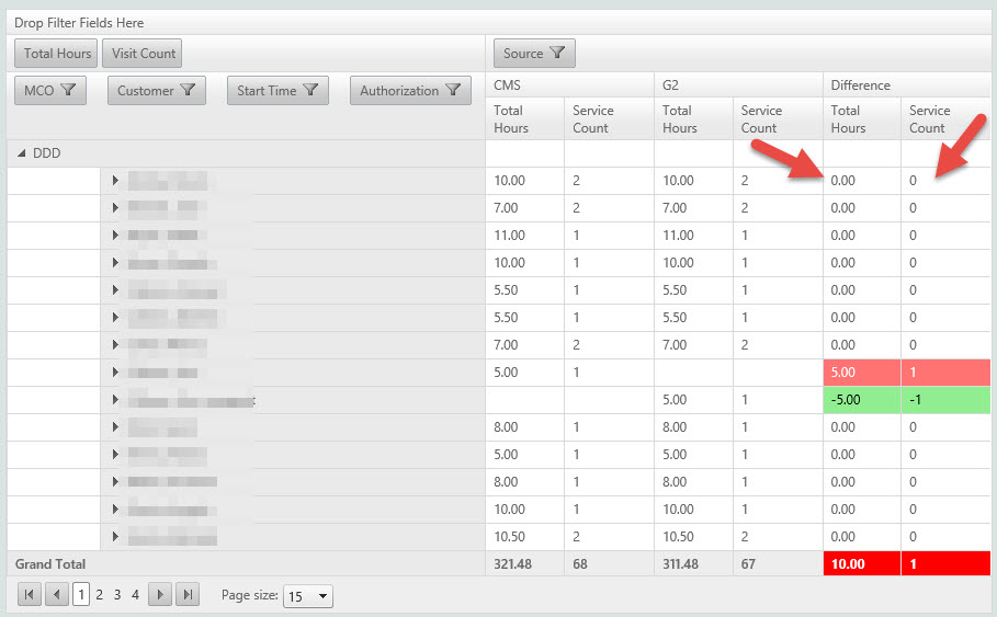 What I am trying to accomplish is that all rows that have a 0 for the "Difference", either in "Total Hours" or "Service Count" shold not display the row. In fact, I have the colorization working the extent that in the attached screesnot, the only rows that should be showing would be the ones colored red or green.