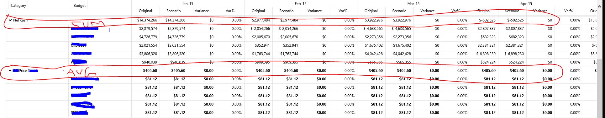 For example : First 5 rows-subtotal have an aggregate as sum and the price rows need average aggregate.currently i am not able find any property or solution to calculate the average.please help any one have solution